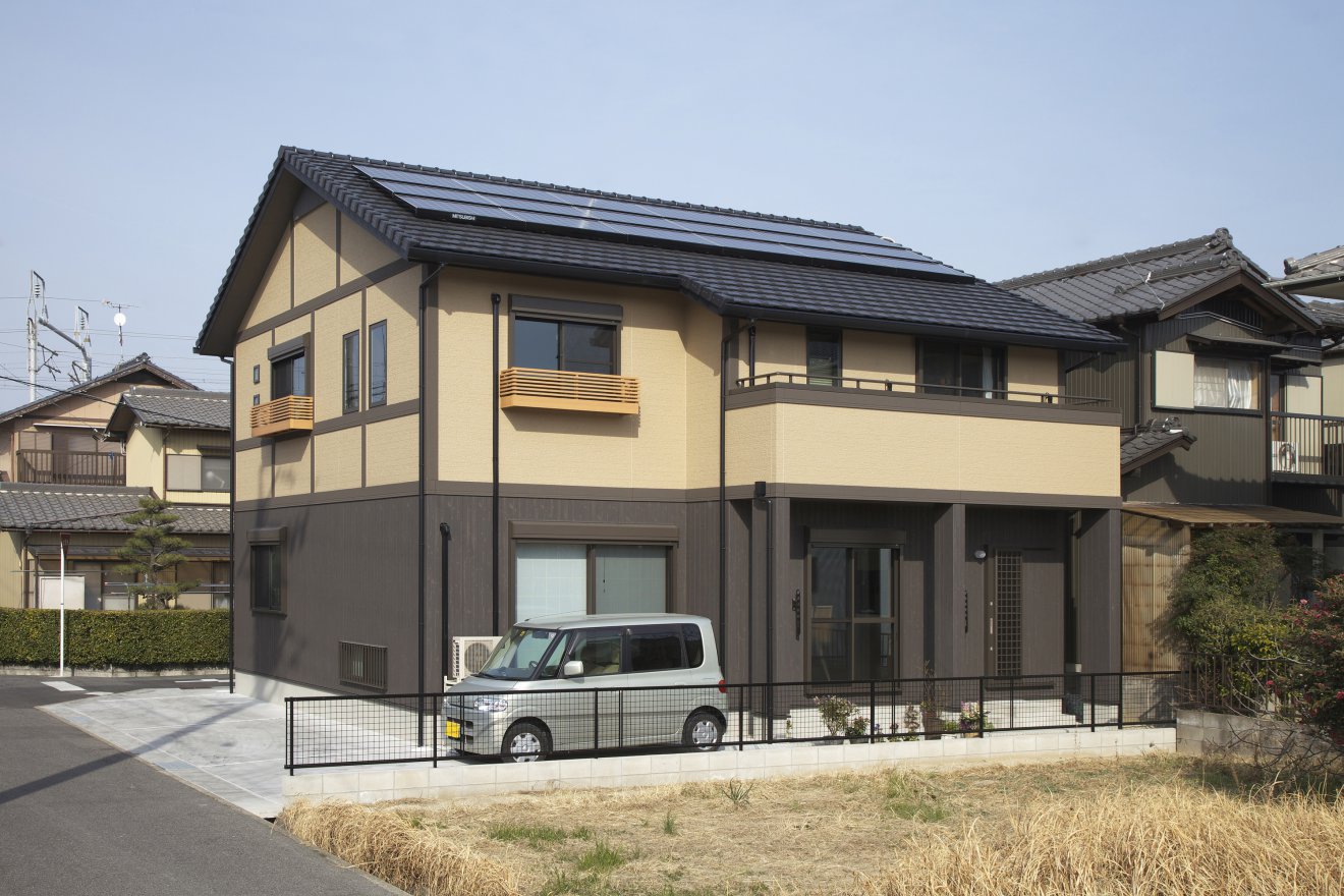 【外観】ベージュとチャコールで構成された風格ある住まい。帯飾りと木調のフラワーボックスで古民家の佇まいを表現しました。