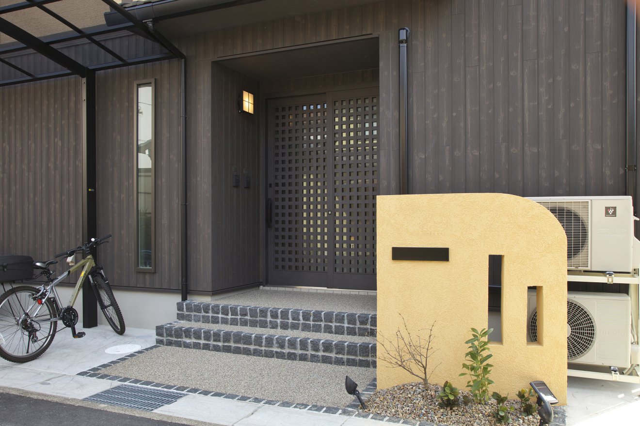 【玄関】木質調の外壁に格子のガラス戸、洗い出し仕上げのポーチを合わせた和の風情あふれる玄関。