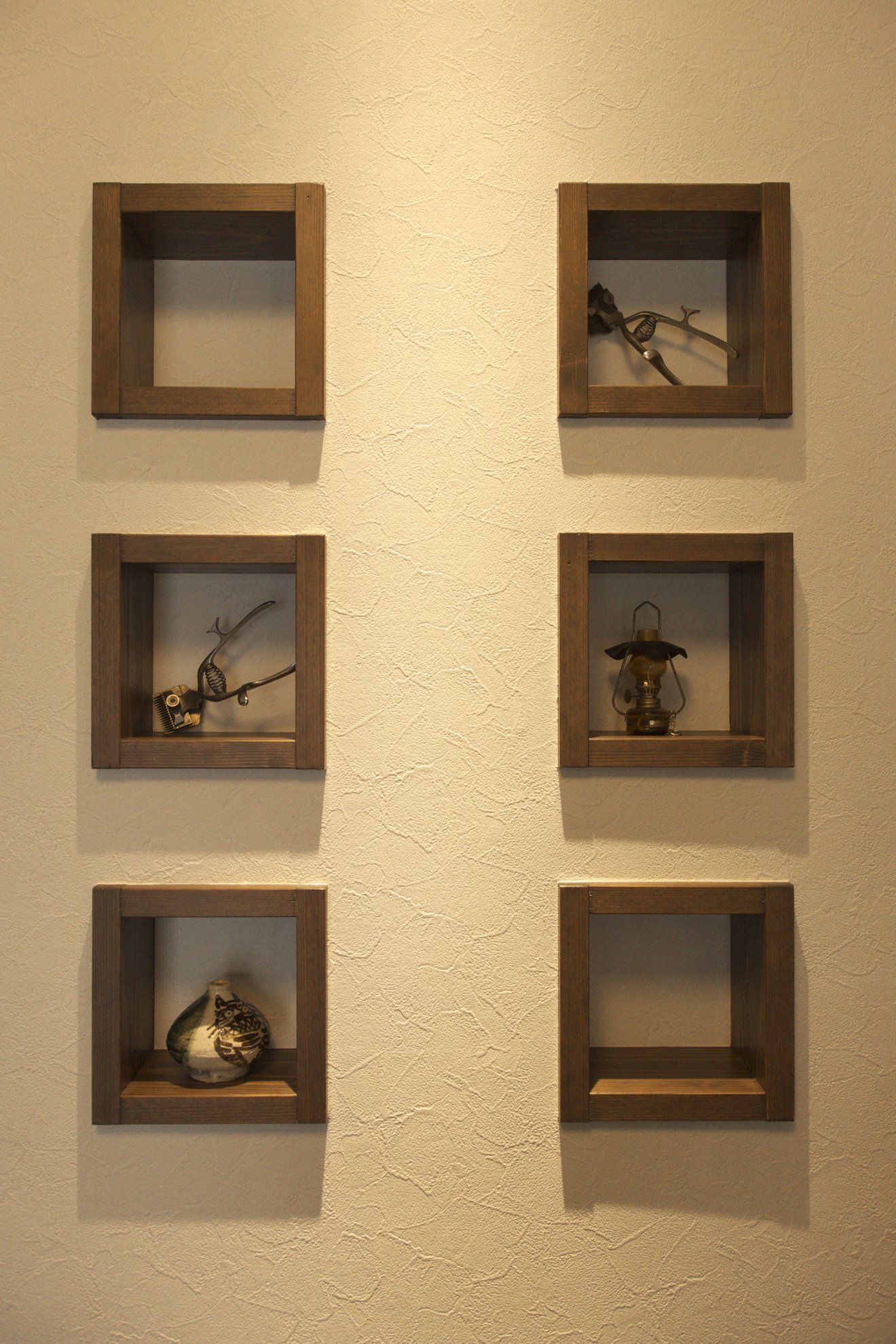 【玄関ホール】杉の腰板や変木デザイン梁が古民家調の味わいを演出しています。六つ並んだニッチにアンティークの小物が良く合いますね。