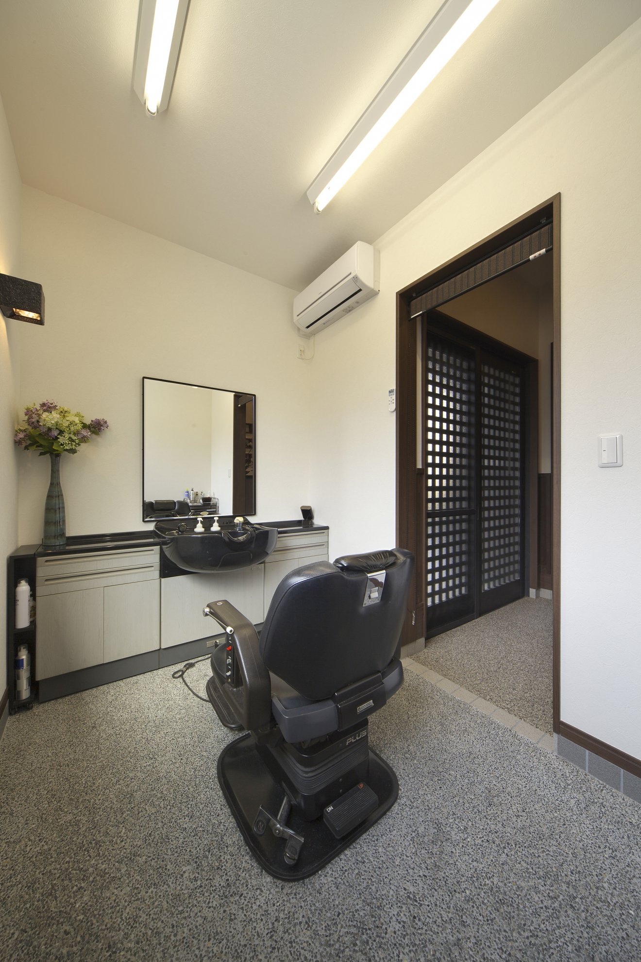 【土間】玄関から直接入れる土間スペース。散髪椅子とシャンプーユニットが備え付けられています。白を基調とした清潔感ある空間です。