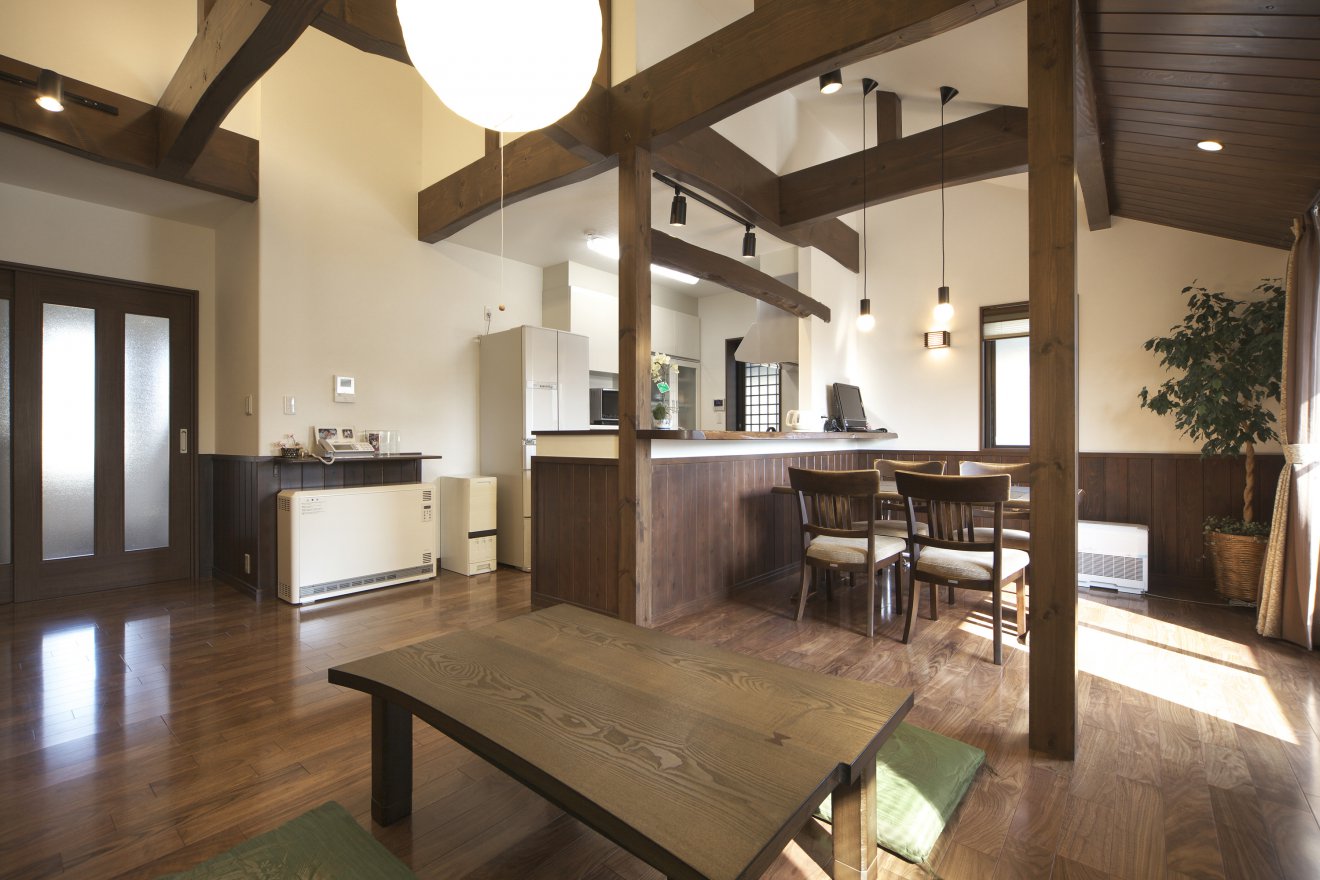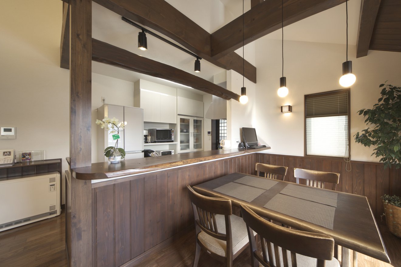 【子世帯LDK】木目が美しいダークブラウンの建材組み合わせ、しっとりと落ち着いた雰囲気に仕上げたLDK。2階にレイアウトしたことで、高さのある勾配天井と古木調の梁見せも可能となりました。