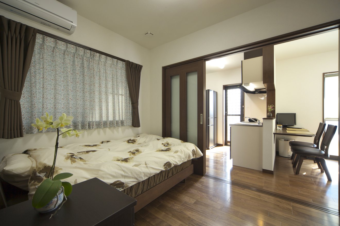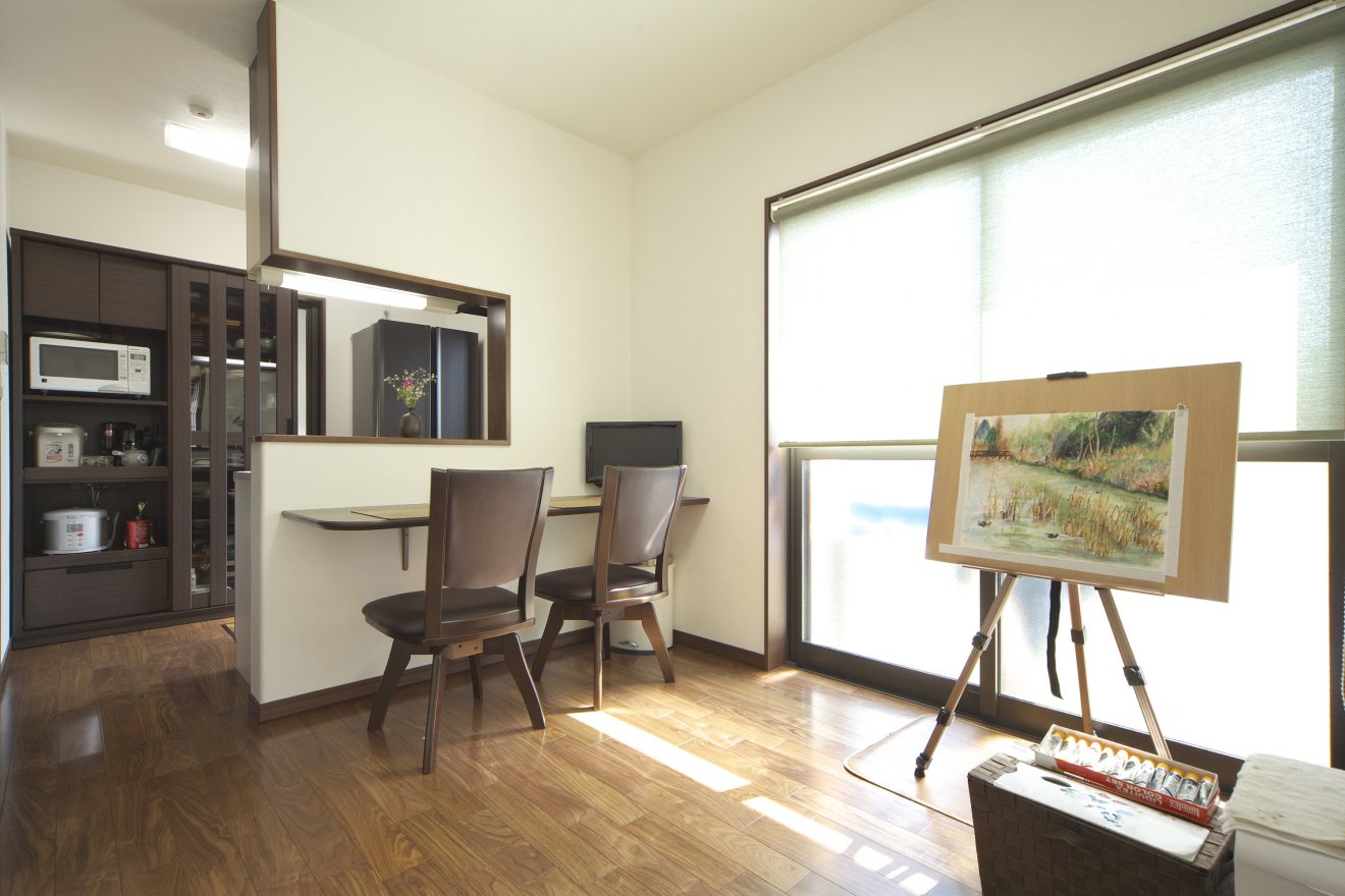 【親世帯DK】ご両親のDKは昇降の手間の無い1階に。広めに取ったダイニングは趣味の絵画を楽しむ空間としても活躍します。 【1階寝室】DKから様子が伺いやすい寝室。建具を完全に閉めれば、一人静かに過ごすことも可能です。