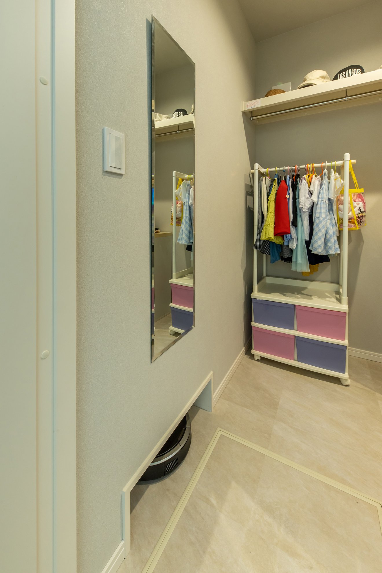 【洗面室】洗面化粧台の横にオーダーで収納を設置。タオルや下着、洗剤等の収納として大活躍します。使用後はロールスクリーンで目隠しできます。 【ファミリーCL】水回りの横にファミリークローゼットを配置しました。家族の朝の着替えはここで完結、とても便利な空間です。