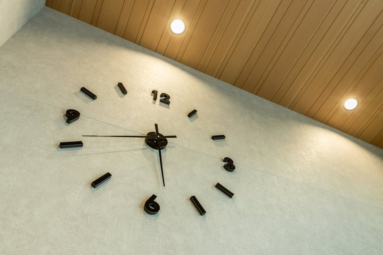 【アクセサリー】高天井の壁面を利用した印象的な時計。ニッチは天井の突板と同材の板をヘリンボーン貼り風にアレンジしました。JIMBOの照明スイッチもポイントです。