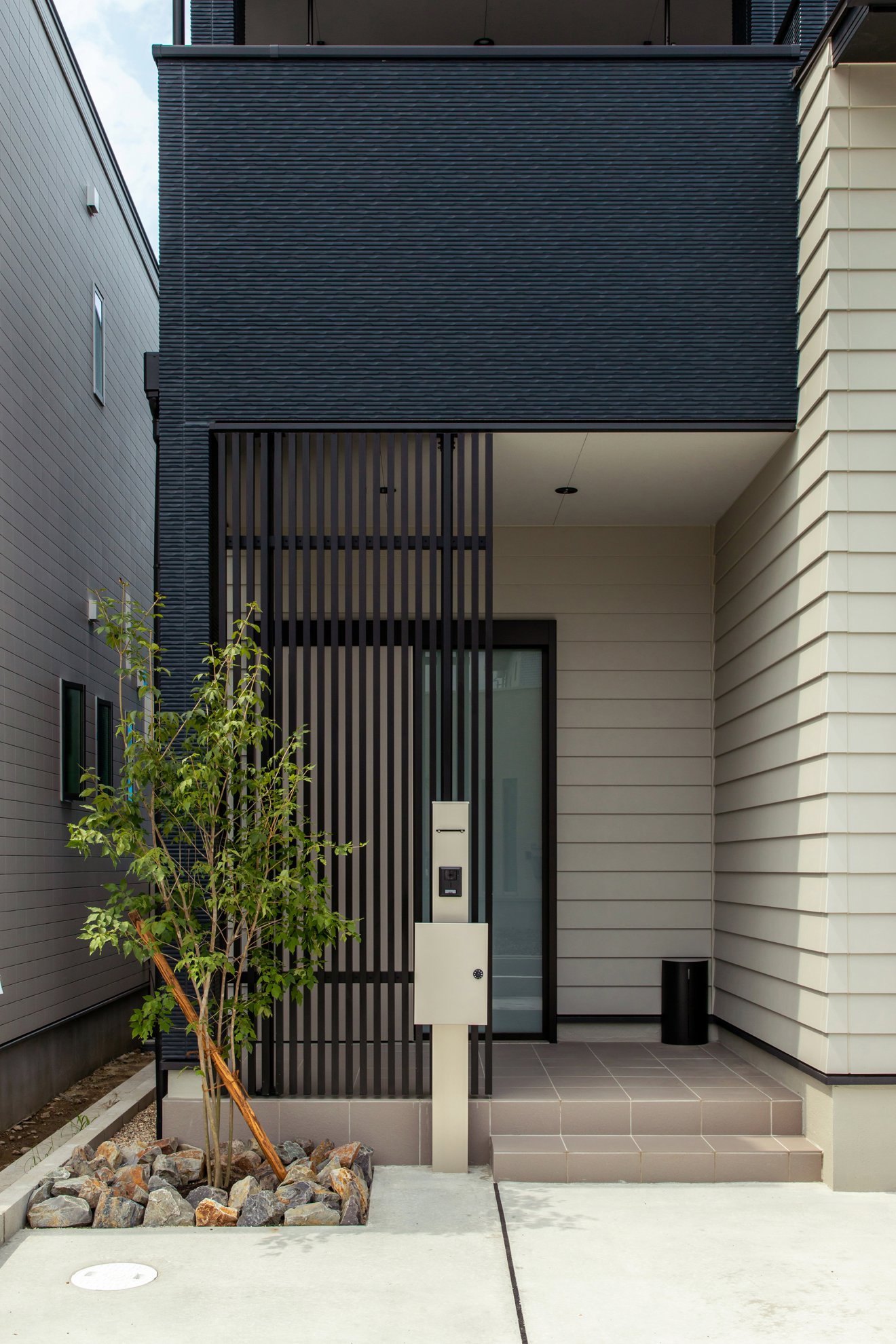 【エントランス】玄関前にスクリーンを設けました。採光を取り入れながら、玄関の中が丸見えにならないアイデアです。