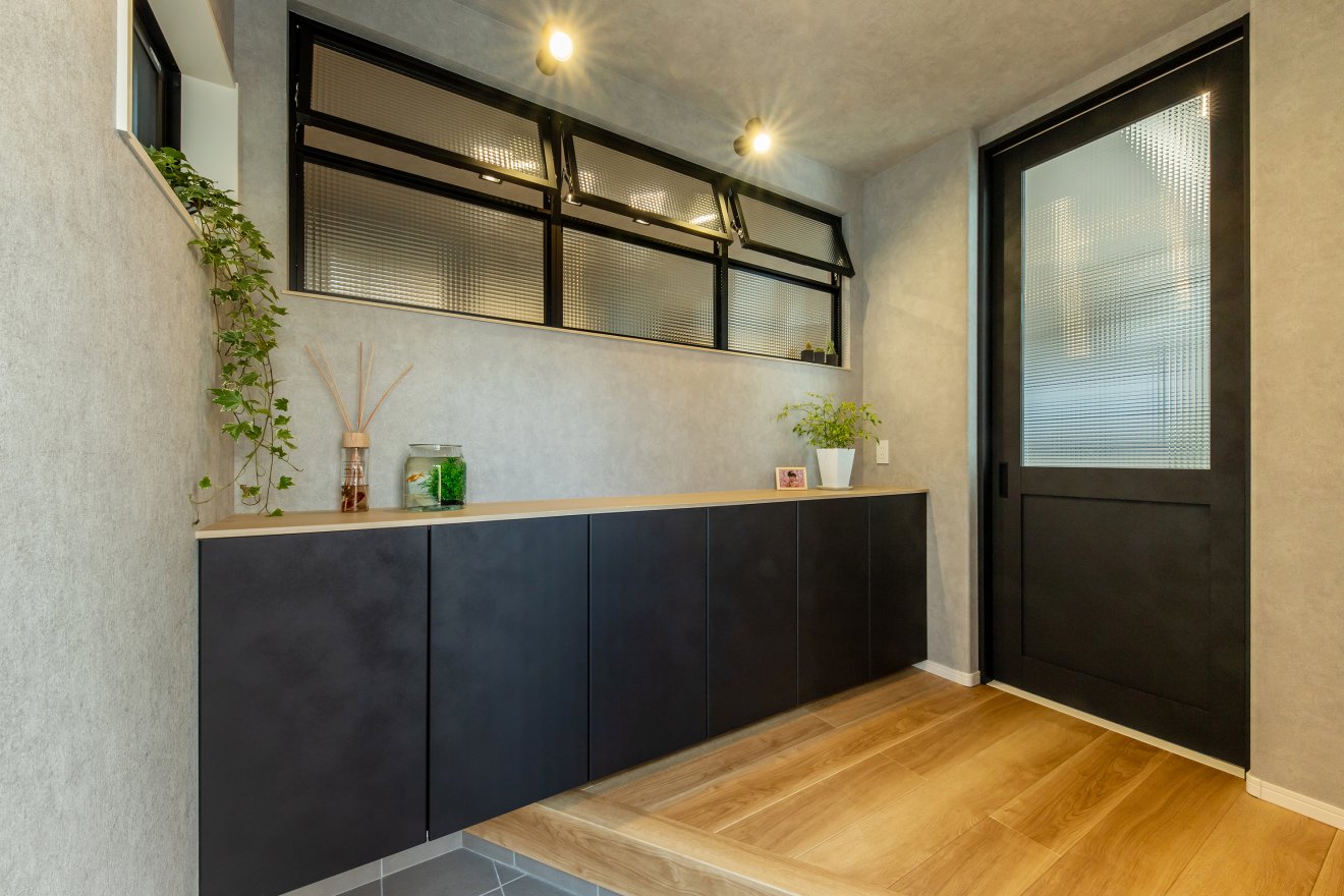 【玄関】片袖FIXの玄関ドアと室内窓を設け、デザイン面と採光の両面を確保。玄関収納とリビングドアとの統一感で、お洒落な空間を演出しました。