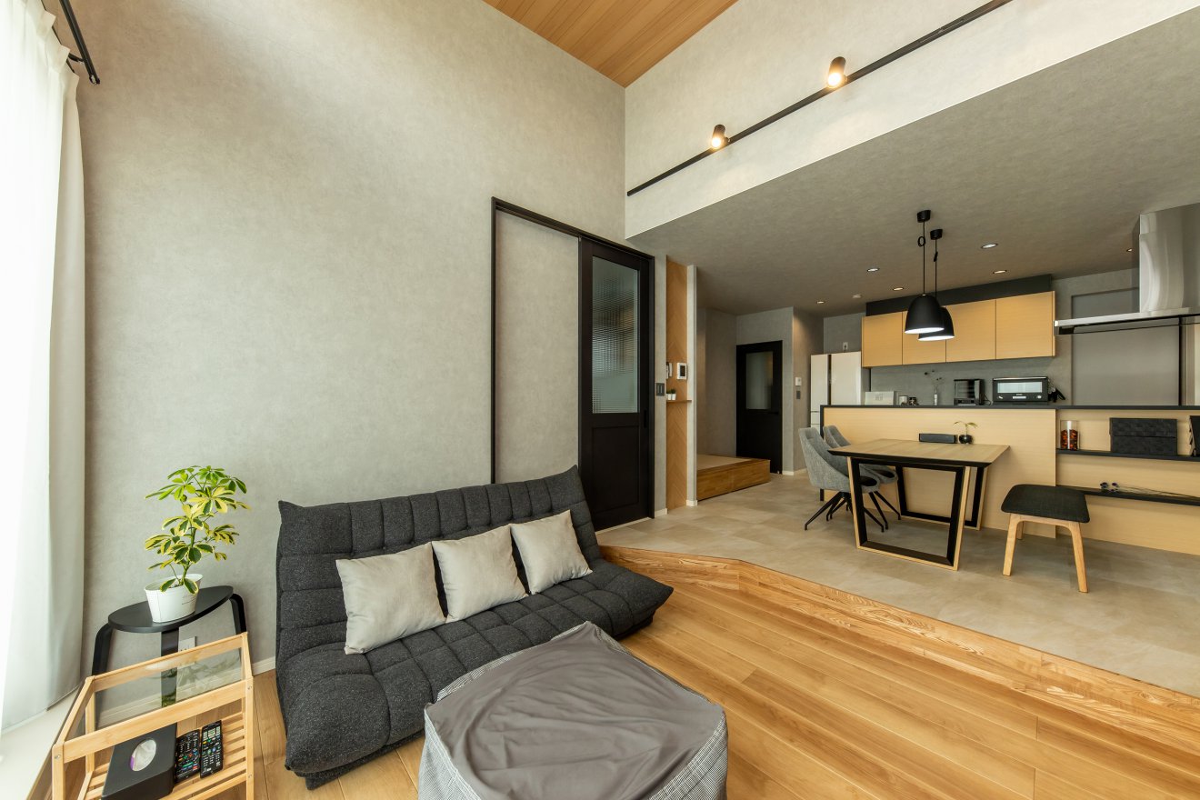 【リビング】明るい木目、ブラック、グレーでカラーリングを統一しました。高天井に設置したシーリングファンは、デザイン面と空調効率をUP。