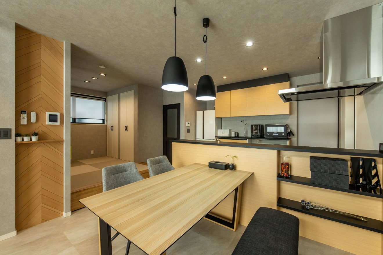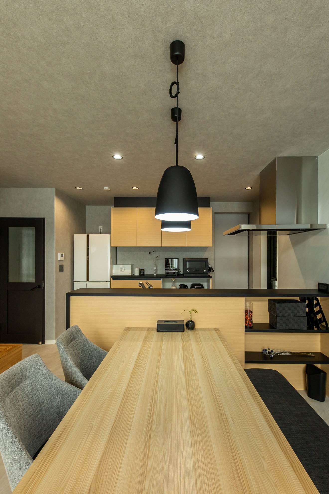 【ダイニング】室内の雰囲気に合わせたマットブラックのペンダント照明。