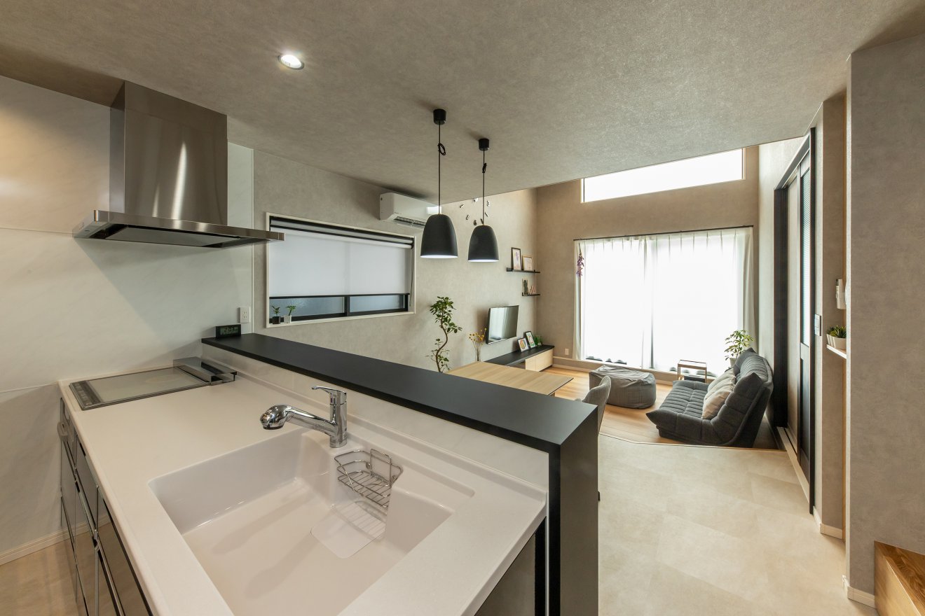 限られた間口の中で収納と生活スペースをバランス良く計画しました。リビングはダウンフロアと高天井を組み合わせることで、より開放的な空間に。また、DKまで光が射し込むよう、高い位置に窓を設けました。明るい木目とブラックをアクセントとしたカラーリングで全体をまとめ、スタイリッシュで統一感のある住まいが実現しました。