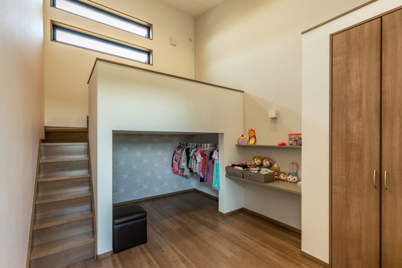 【吹抜】大きな窓から光を取り込みます。 【子供部屋】勾配天井で開放的な空間に。ロフト部を就寝スペース、下部は収納スペースとすることで、使い勝手が広がります。