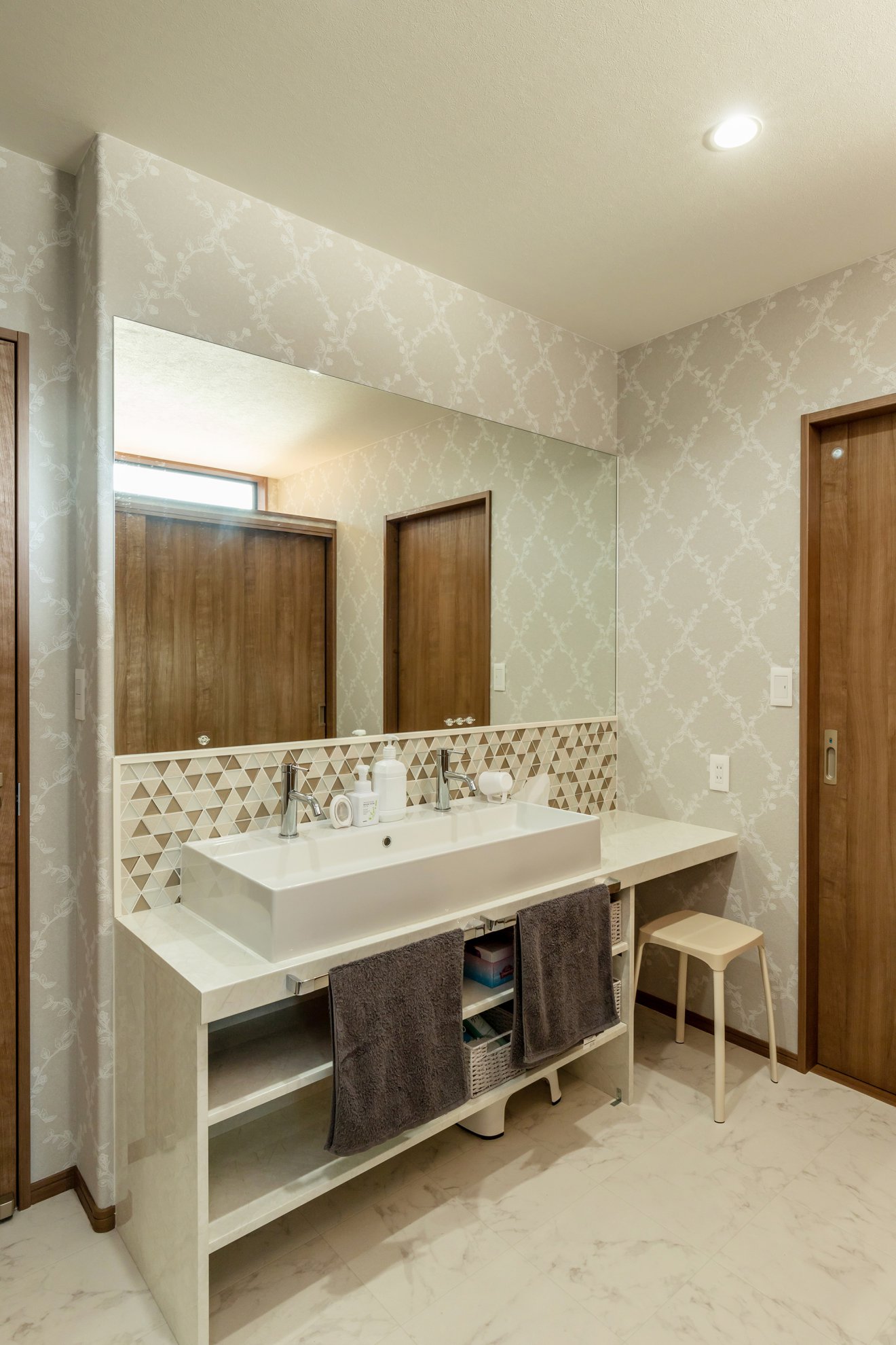 【洗面】ご家族が一緒に使える大きな造作洗面。 【寝室】ベッドヘッドに造作カウンターとアクセントクロスを施工。使い勝手を重視しました。