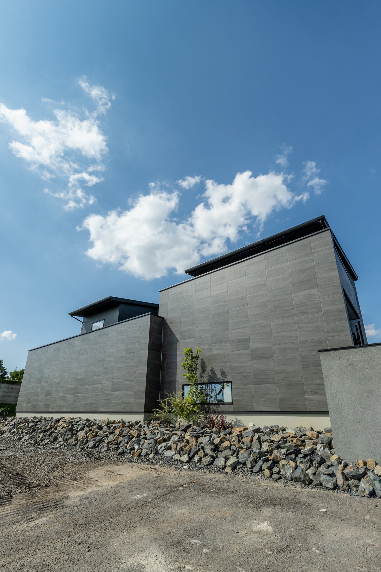 【外観】大きなタイルで仕上げた壁面はプライベート空間とのパーテーション。高さと奥行に変化を持たせることで、より大きく壮観な印象に。