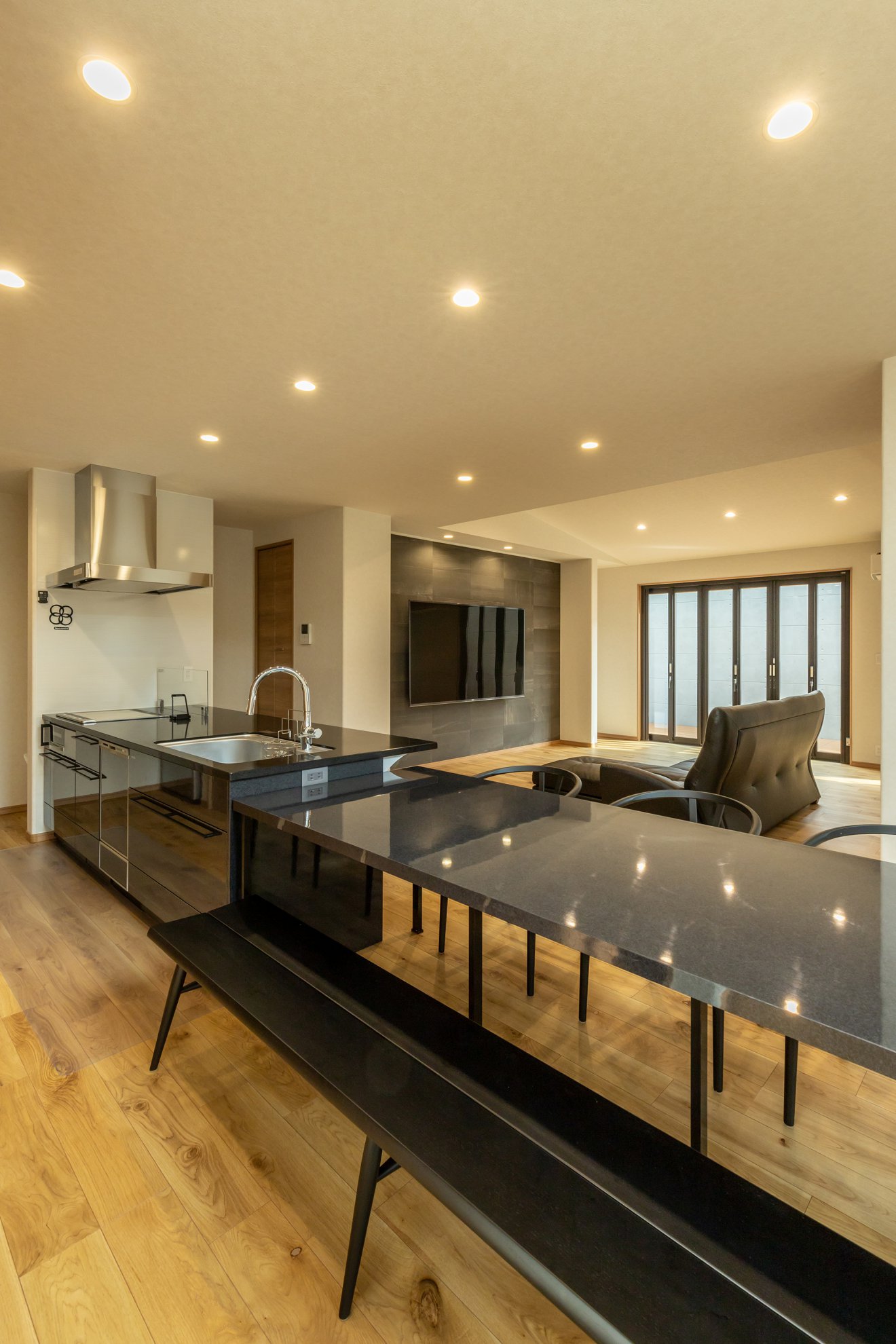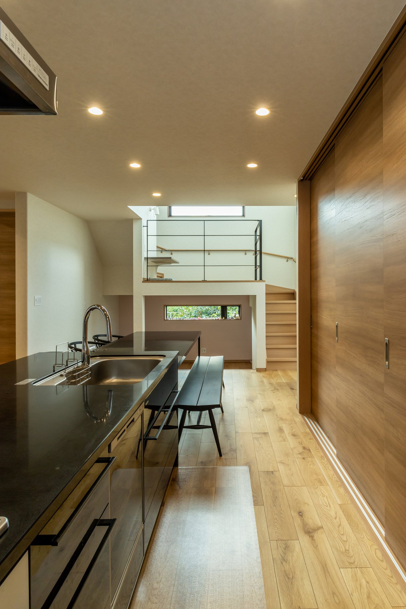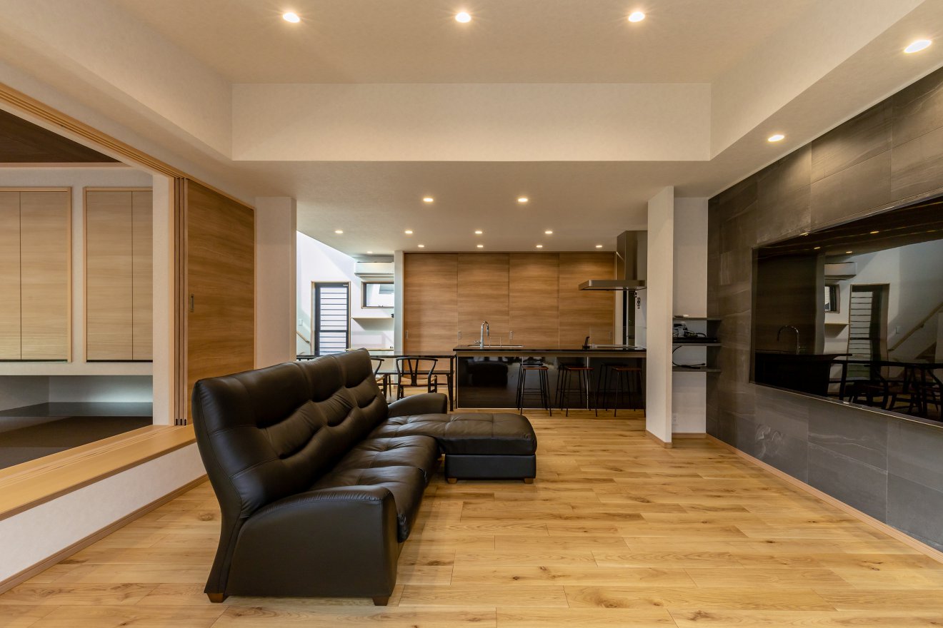 【キッチン】キッチンからの視線を意識し、リビングからタタミコーナーまで見渡せます。背面にはクローズ式の食器棚を採用し、生活感を隠せる工夫しました。