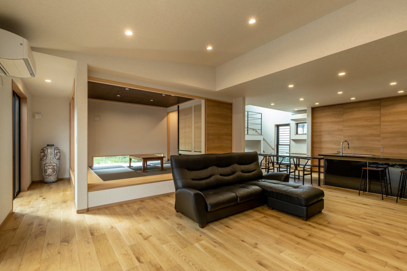 【リビング】リビングを中心にダイニングキッチン、タタミコーナー、ウッドデッキへと周回できるよう動線を計画しました。