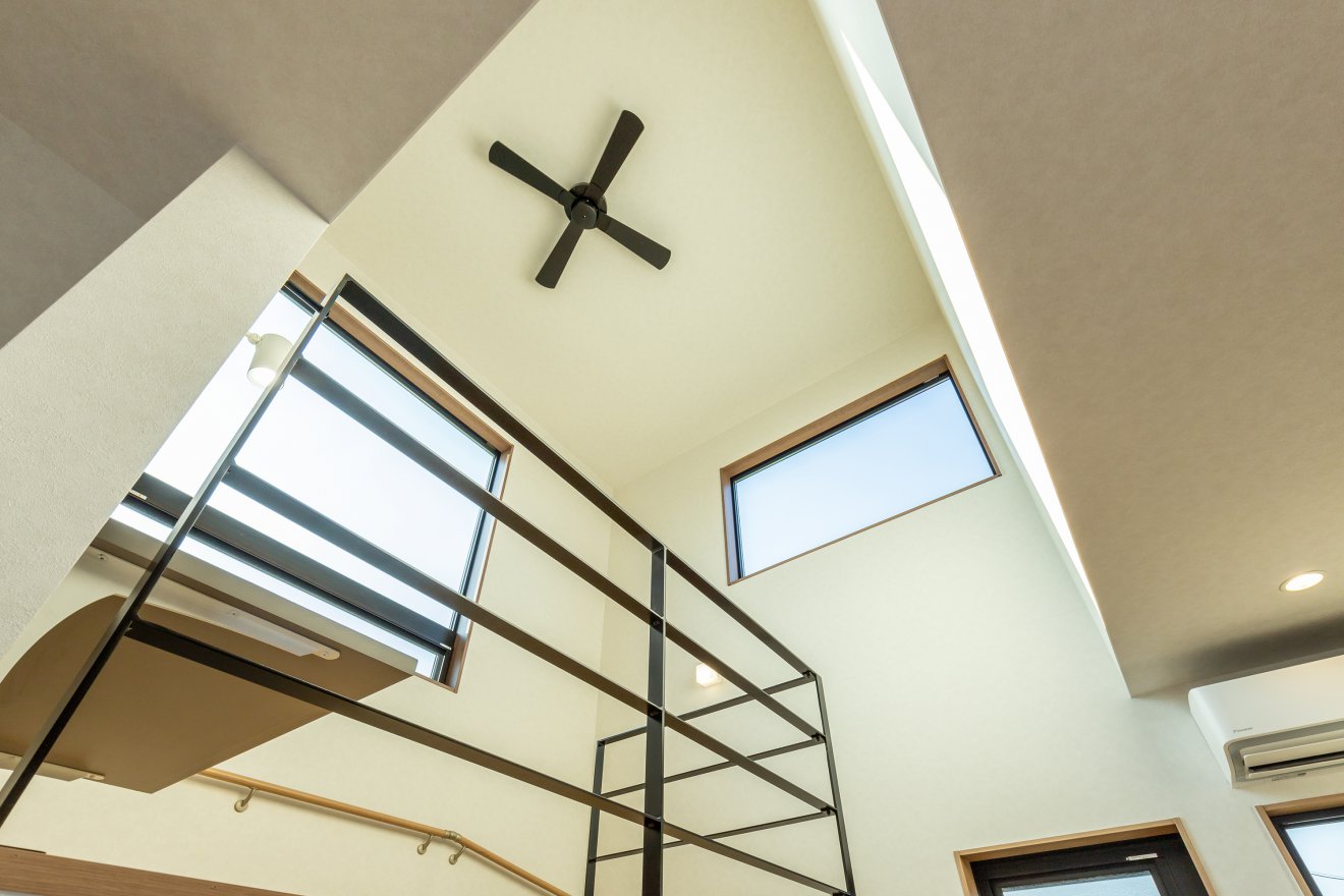 【吹抜】アイアン手摺とシーリングファンはブラック色で統一。シックにまとめました。