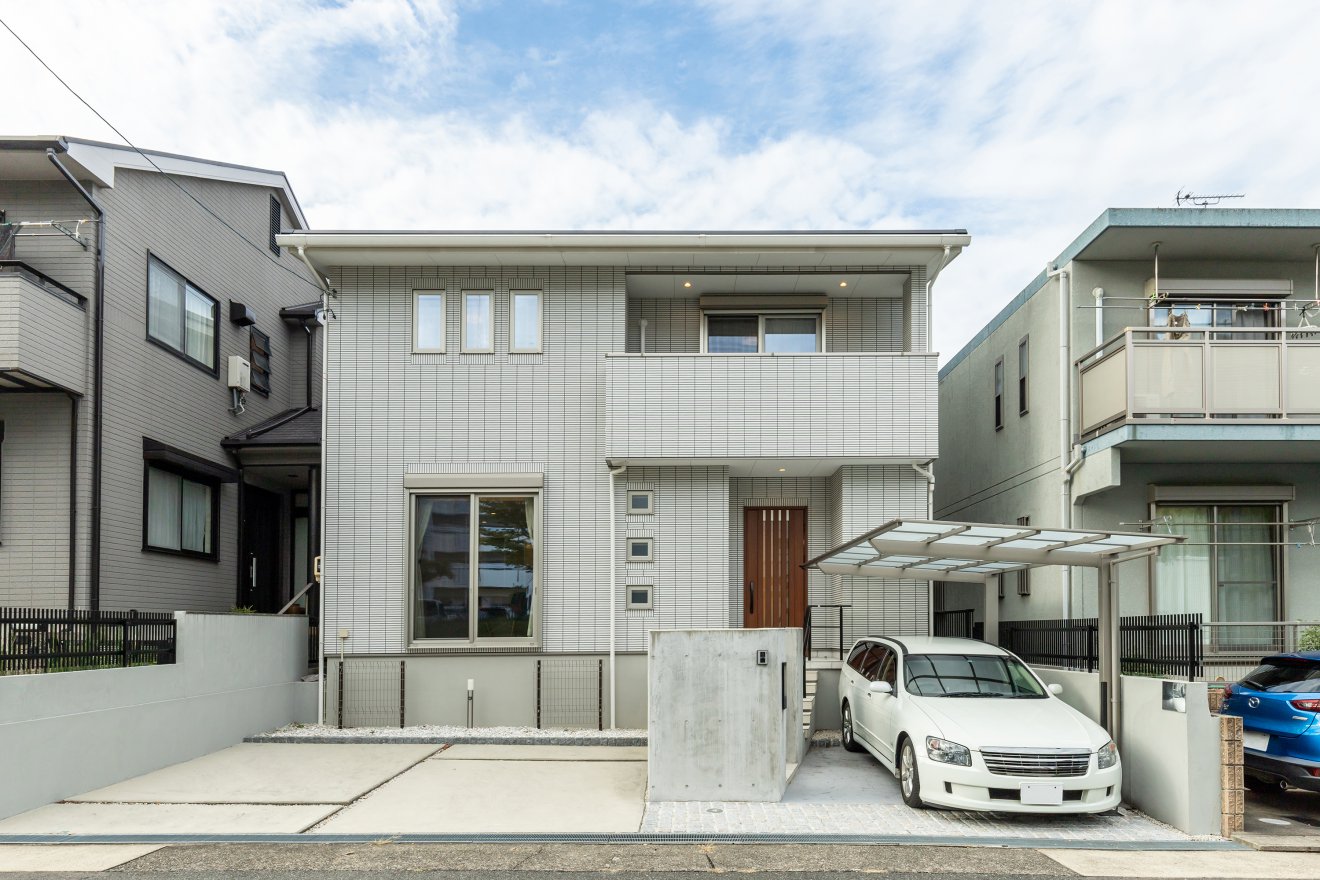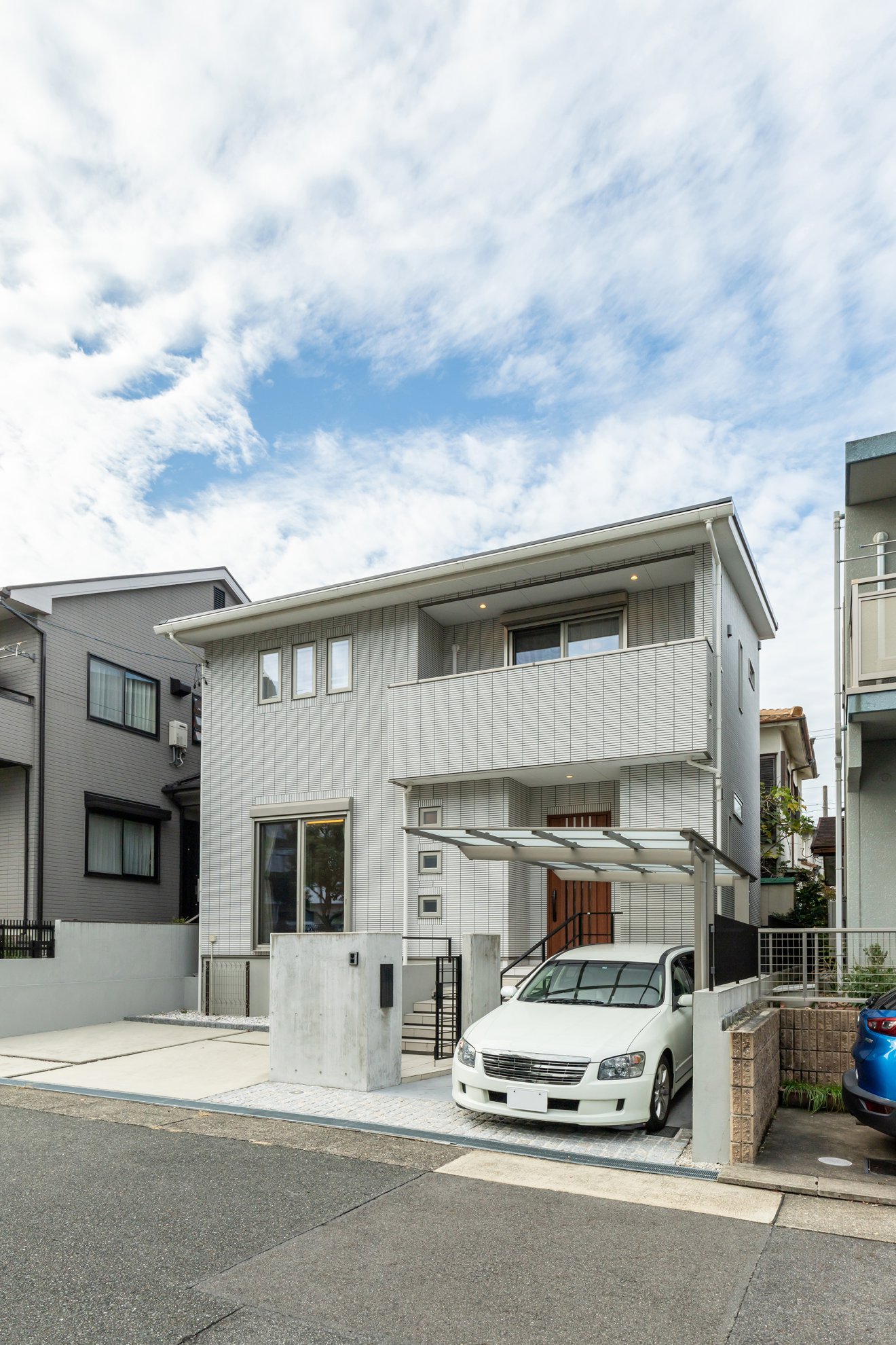【外観】外壁は総タイル張りにすることで、シンプルで飽きのこないデザインに。白やグレーを基調としコンクリート打ちの門柱など、外構も統一感を演出しました。
