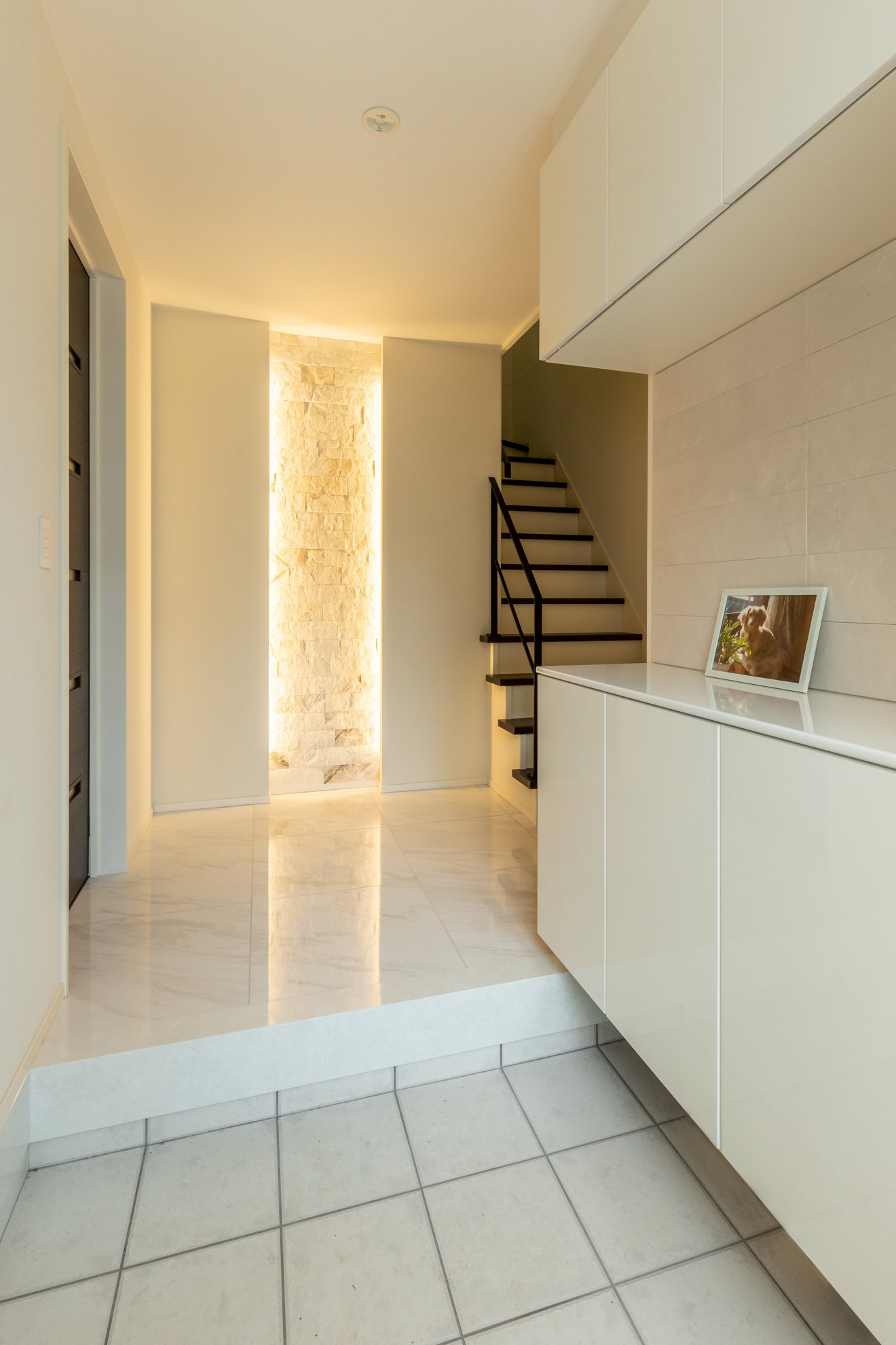 【玄関ホール】玄関入って正面に、天井いっぱいのタイル張り。間接照明で目線を惹きつけます。