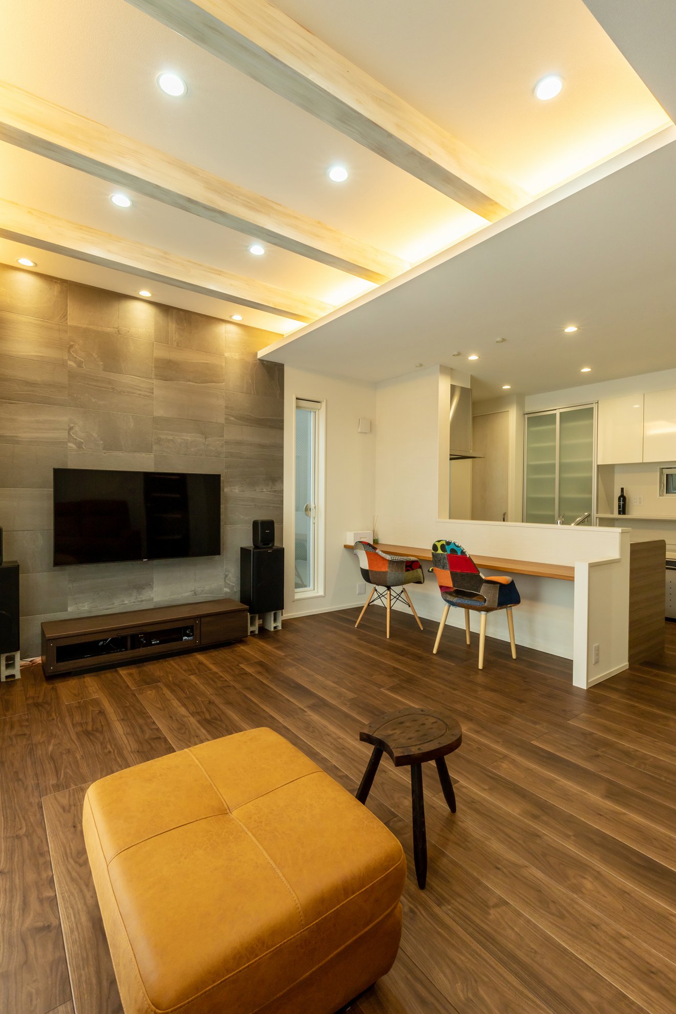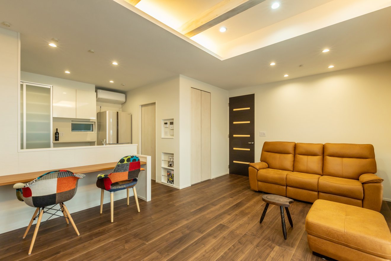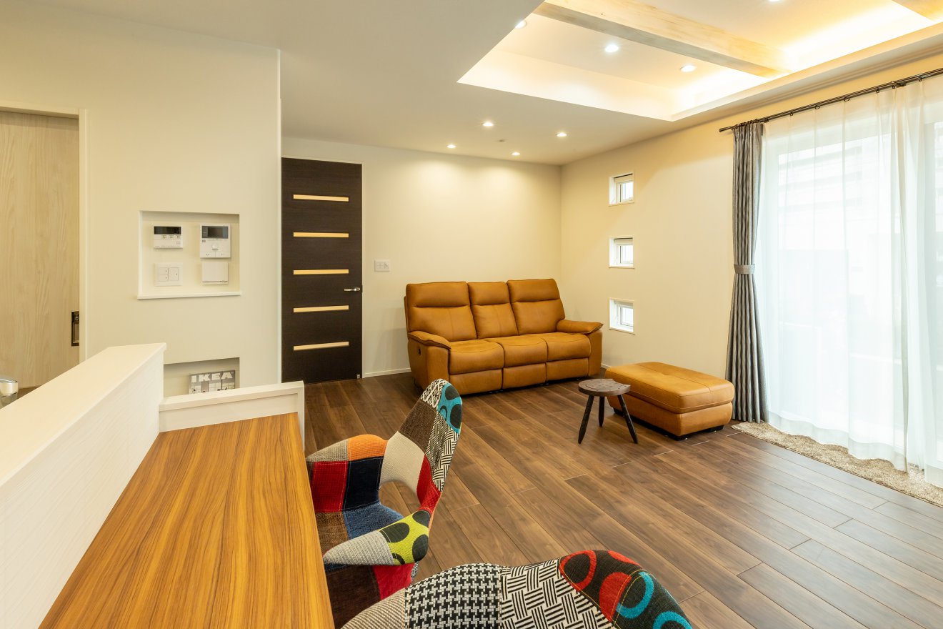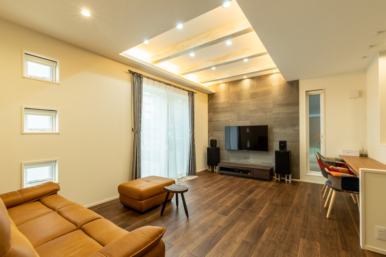 【LDK】縦に広がりを演出する折り上げ天井。リビングは寛げるよう、あえてダイニングテーブルは置かず、リクライニング機能付きソファを配置しました。