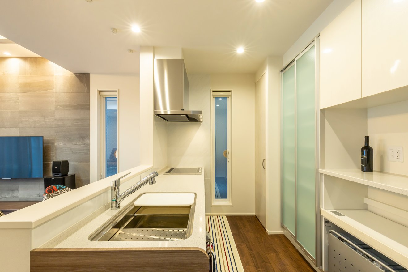 【キッチン】キッチンから洗面脱衣所、そしてUBへと直線で繋いだ使いやすい動線。キッチンの手元は隠しつつ、圧迫感のないように。