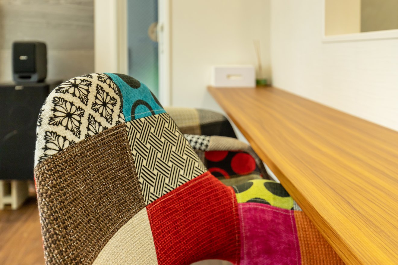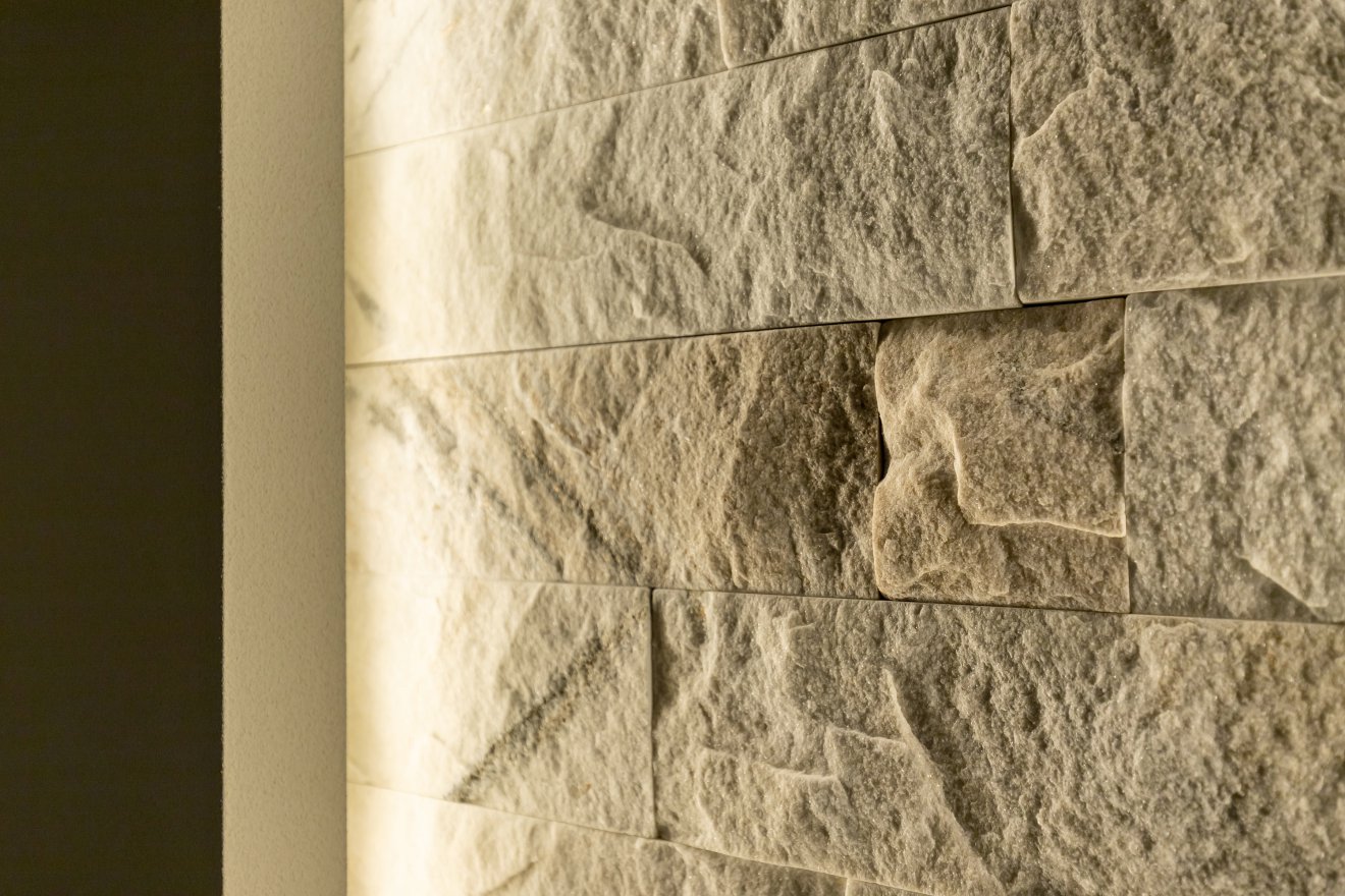 【家具】シンプルな内装に家具でアクセントを。 【タイル】間接照明のタイルは大きめで凹凸感のあるものを採用し、陰影を強調しています。