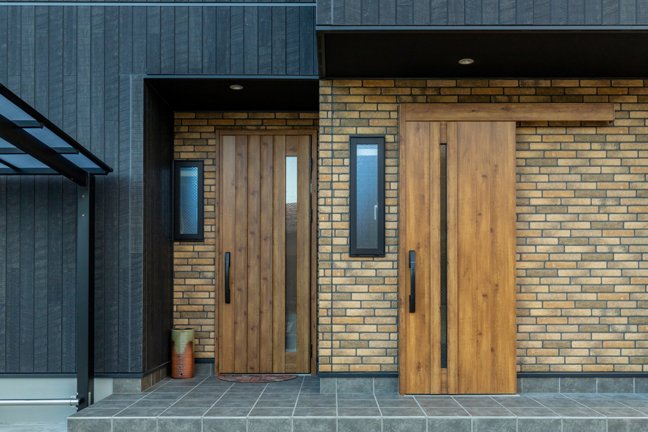 【外観】黒の木調外壁とレンガ調の外壁を組み合わせたスタイリッシュなデザインです。