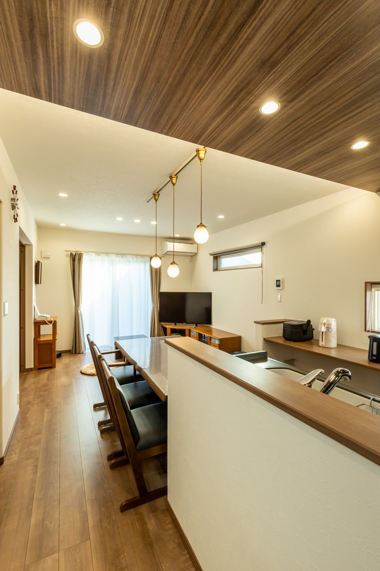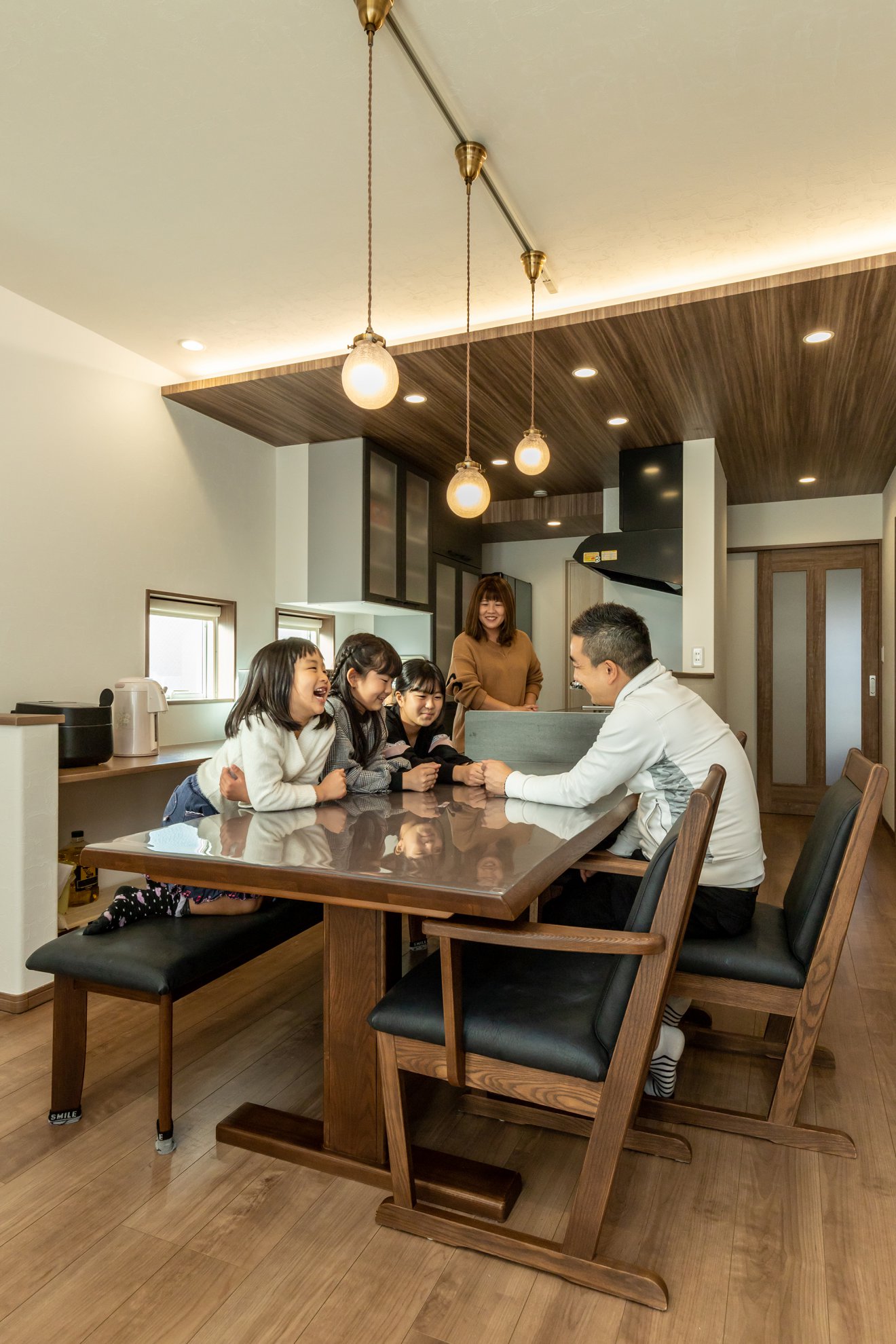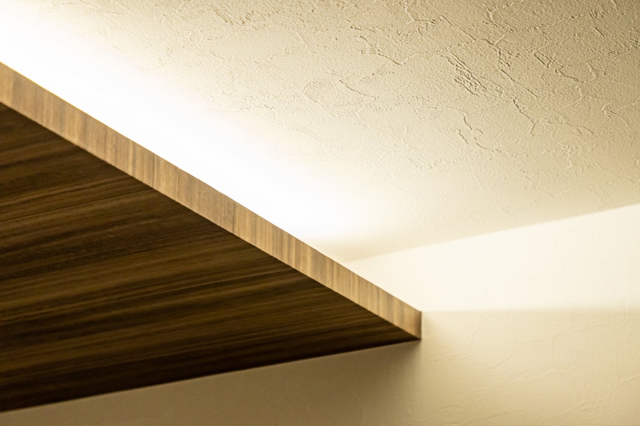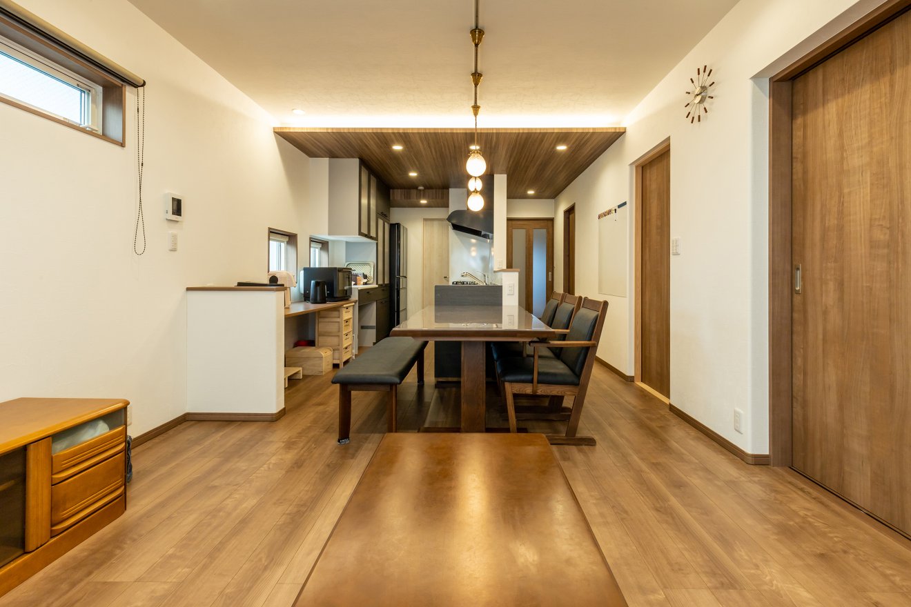 【LDK】木をふんだんに使った1階LDKは、キッチンの天井面を下げ、空間に変化を持たせました。さらに間接照明を施すことで、柔らかな雰囲気を演出しています。