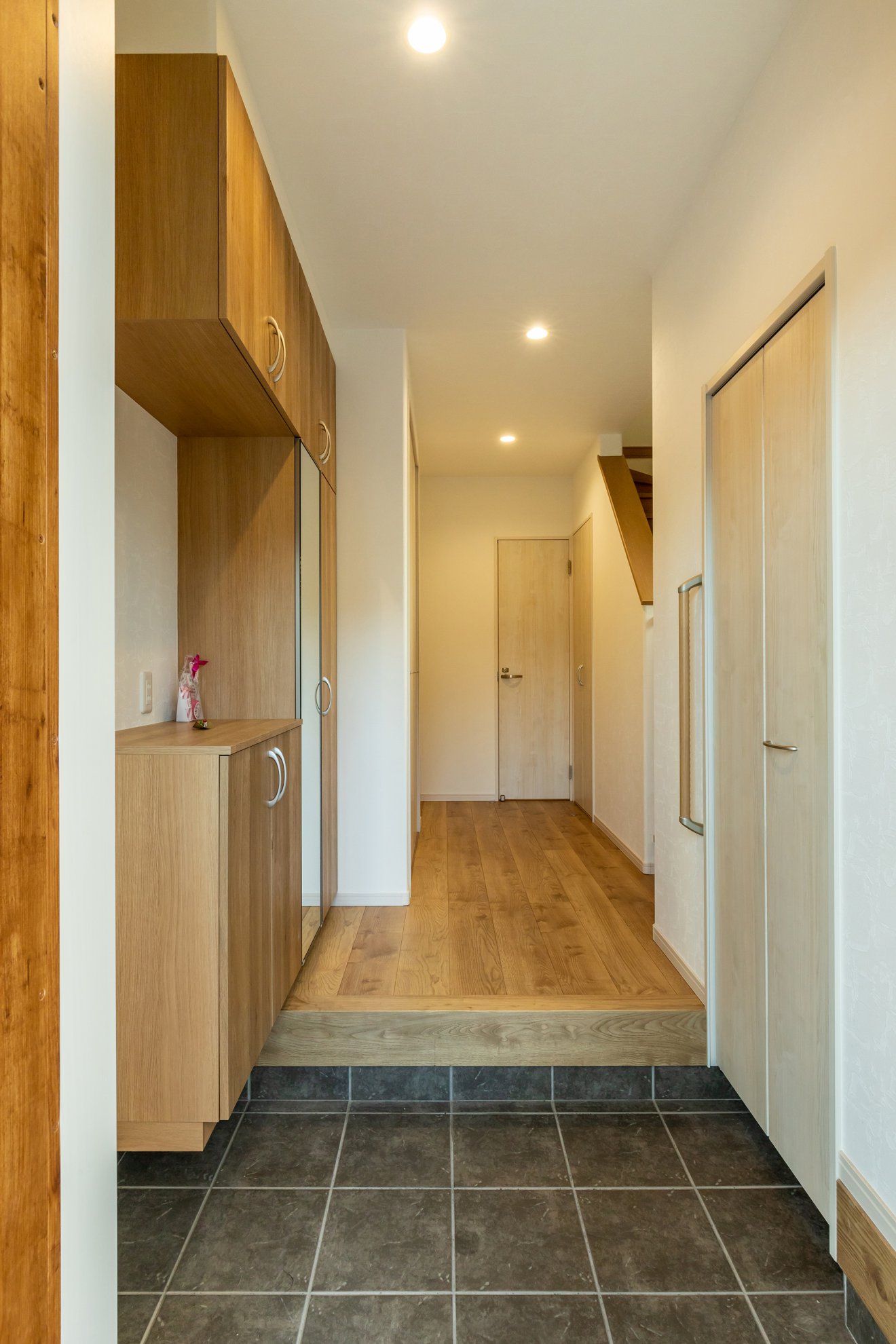 【玄関】お互いのプライバシーに配慮して、各住居ごとに玄関を設けました。 【玄関ホール】暮らしやすさを重視して、手すりを据え付けた親世帯の玄関ホール。