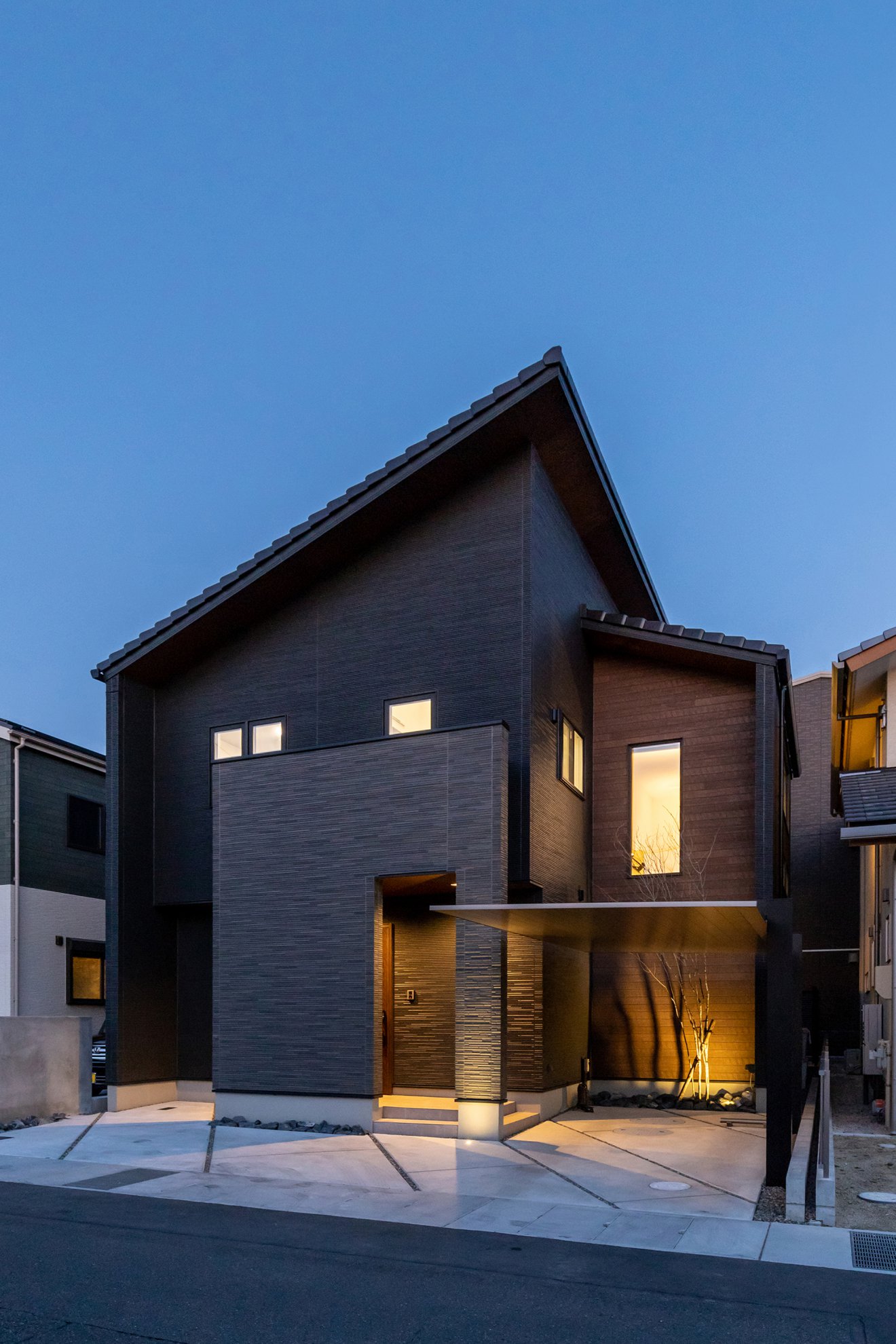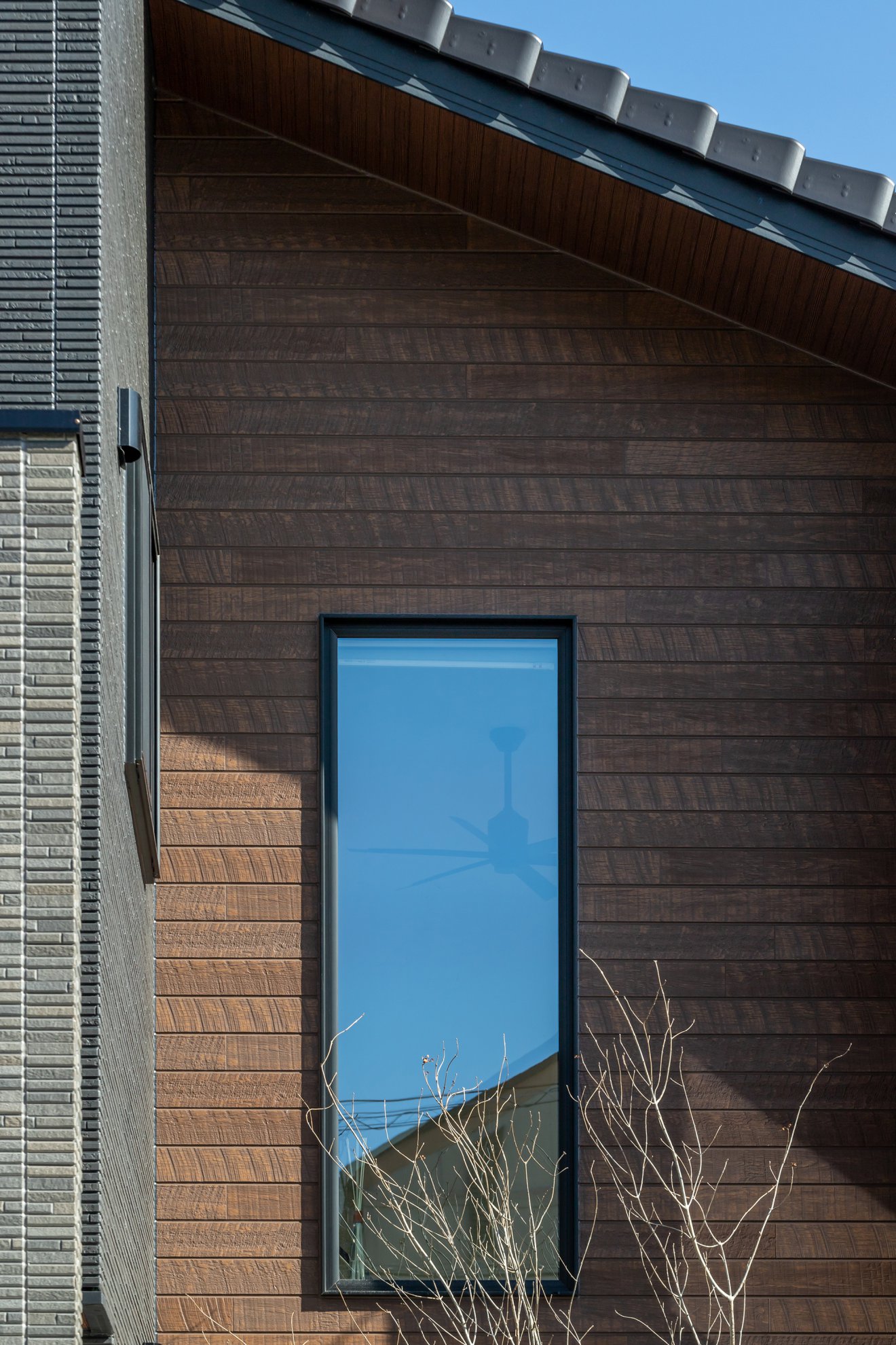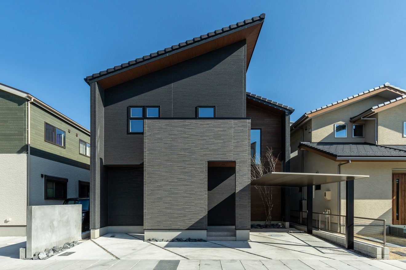 【外観】片流れ屋根と黒を基調とした外壁がモダンな印象を与えます。 【窓】2階とスキップフロアをつなぐ階段部分に大きなFIX窓を設けました。明るさと開放感を同時に得ることができます。