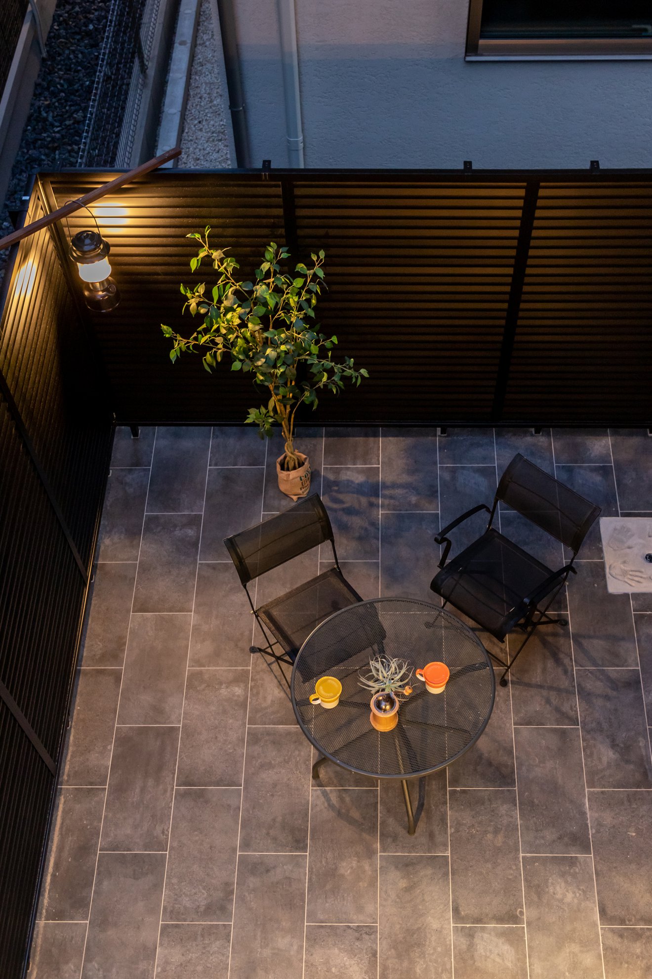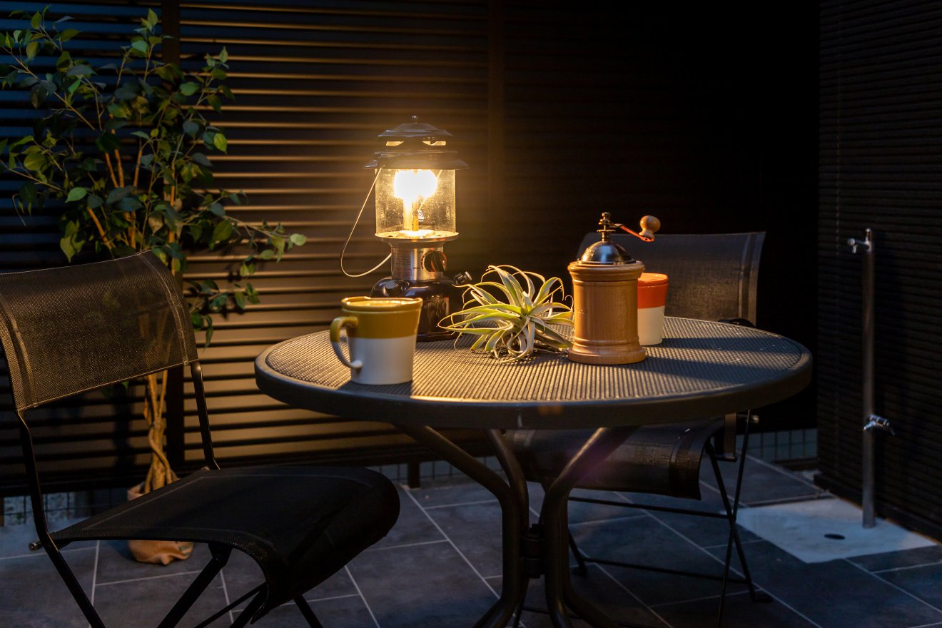 【夜景・テラス】ランタンの灯りが幻想的なテラス。外部からの視線をカットした中庭空間は、夕涼みや夫婦の語らいなど多目的に使えます。