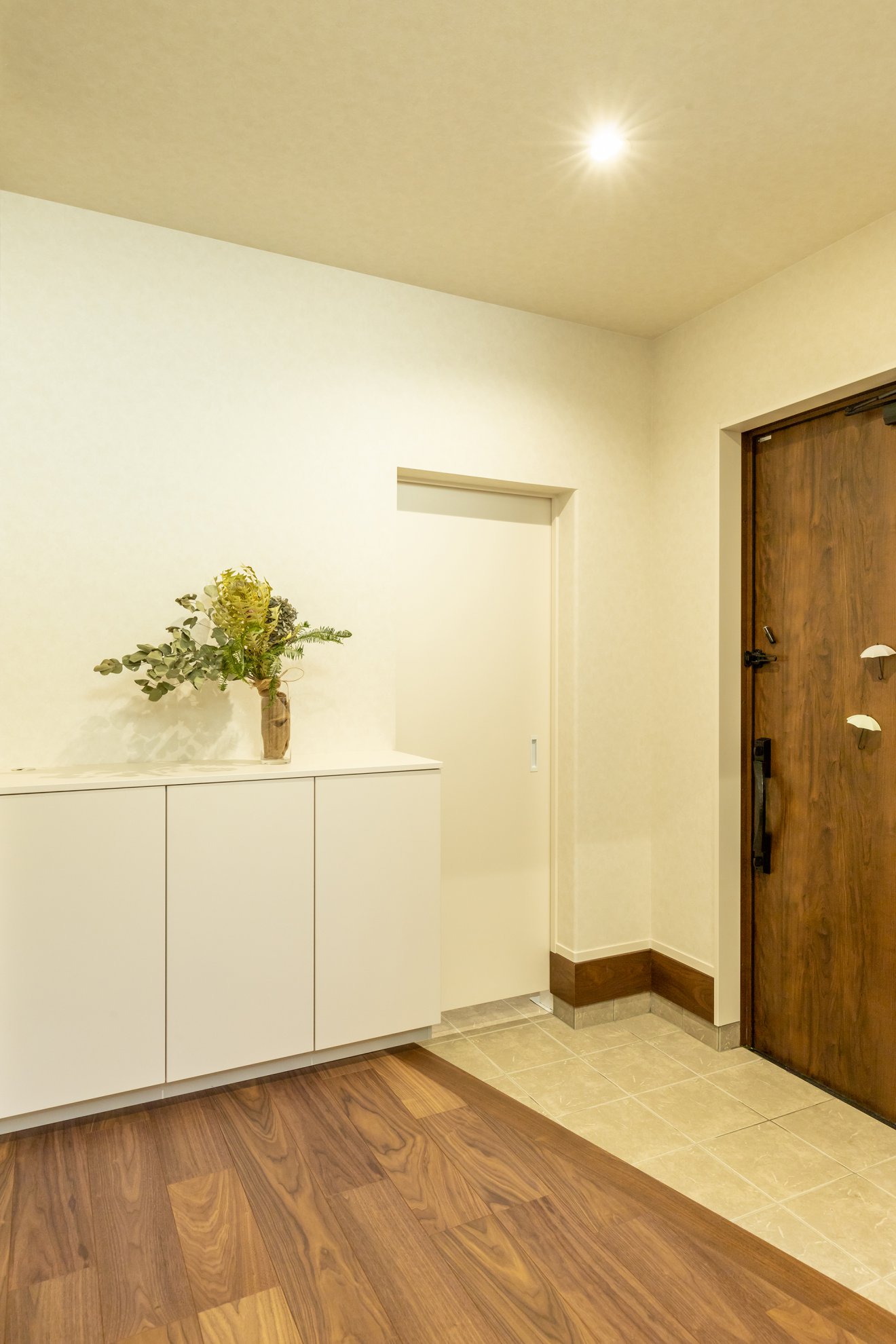 【玄関ホール】白を基調とした明るい玄関です。シューズクローゼットは来客から見えないように引き戸を設けています。 【リビング】併設したステップフロアが縦方向へ視線を導くため、空間にメリハリが生まれます。