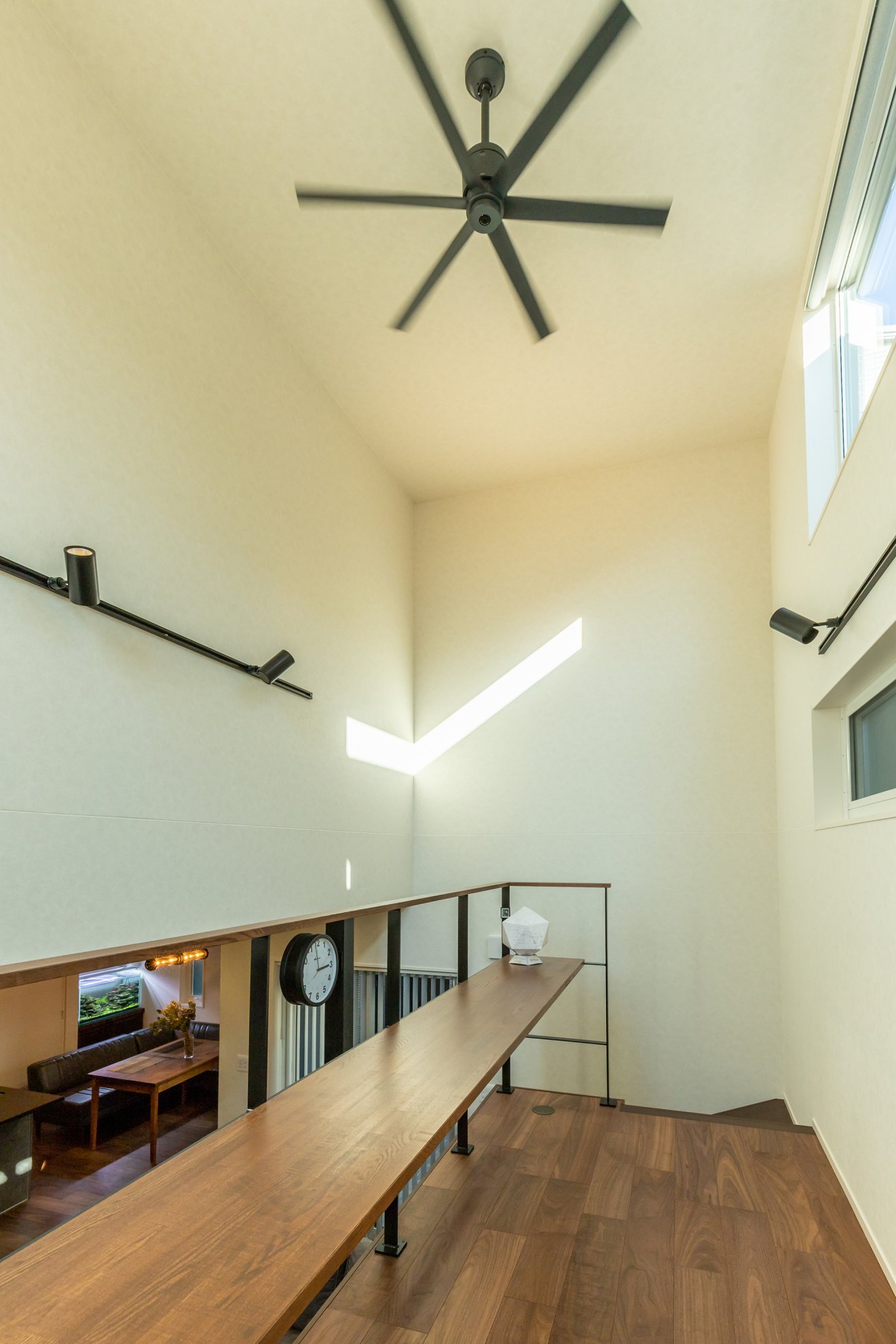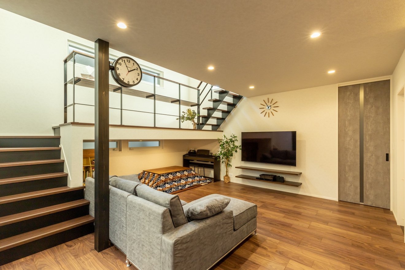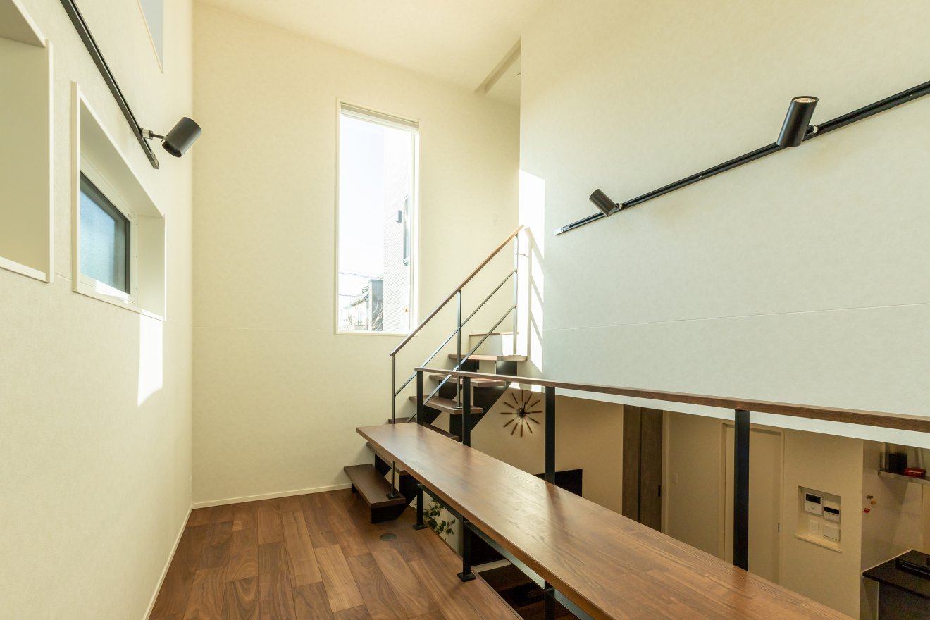 【スキップフロア】複数の窓から光が差し込む明るく開放的な吹抜け。 【階段】光が階下まで届くように、鉄骨ストリップ階段を採用しました。