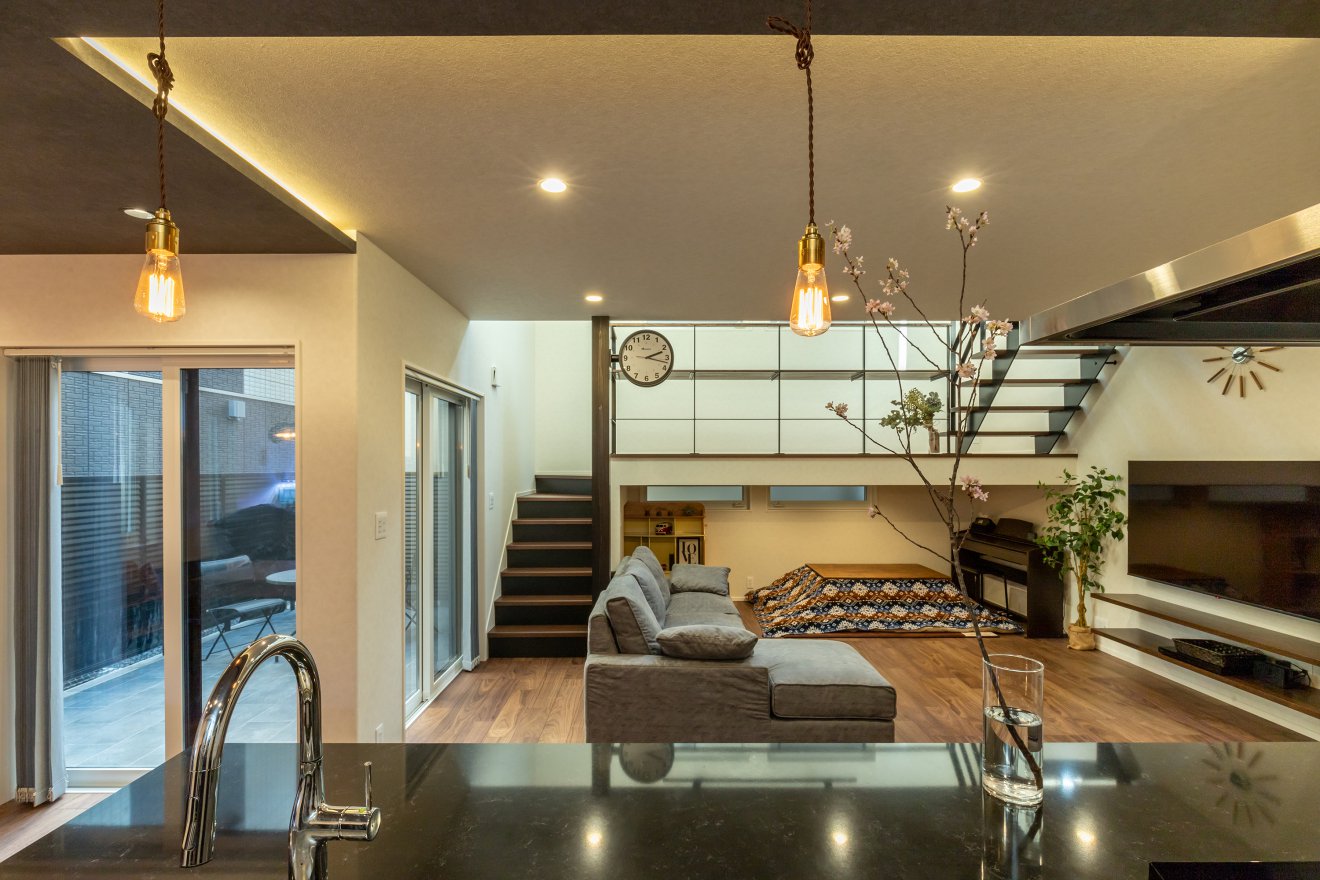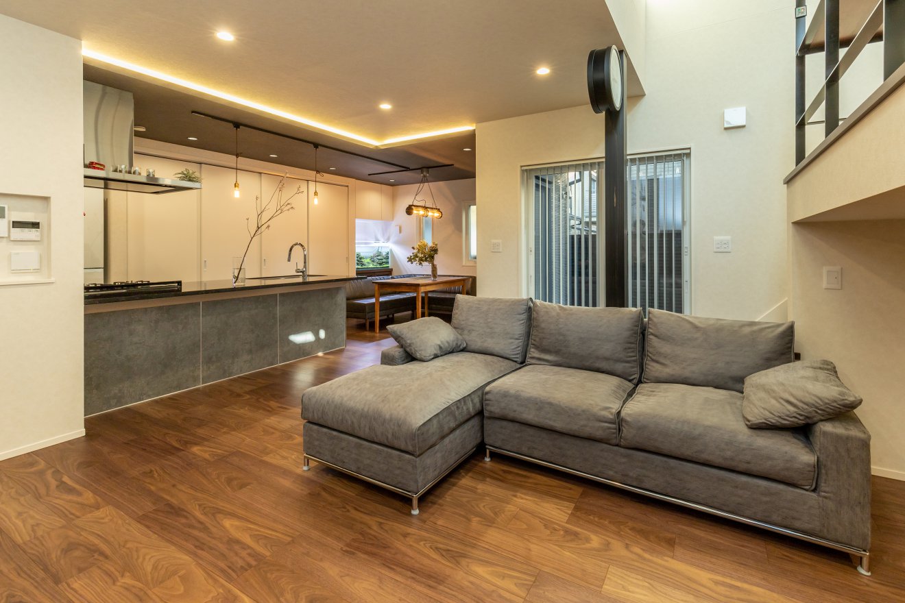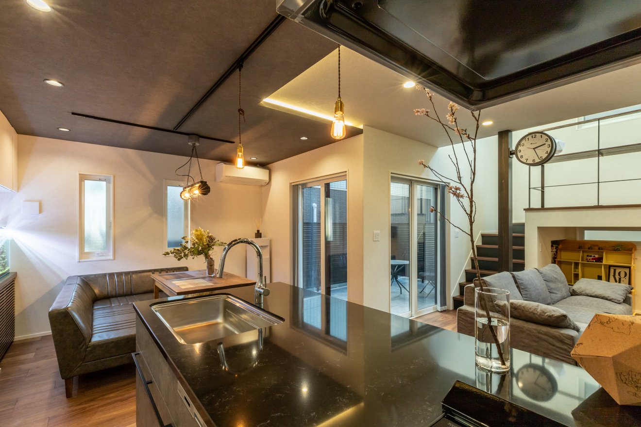 【キッチン・ダイニング】リビングから天井を一段下げ、間接照明を施しました。お洒落で落ち着いた空間を演出します。 【キッチン・リビング】キッチンからは、リビング・ダイニング・スキップフロアの全てが見渡せます。お子様のことを気にかけながら家事ができるため安心です。