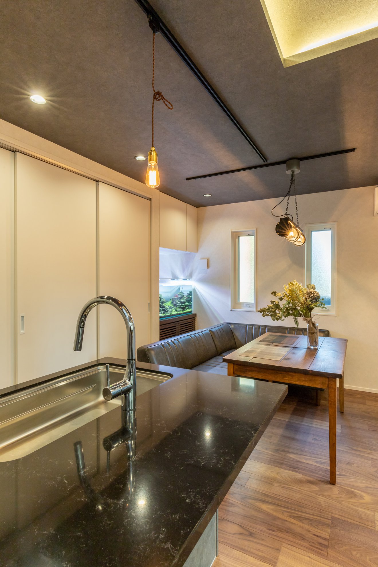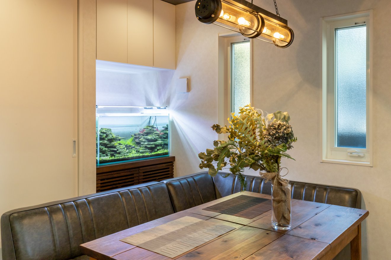 【照明】キッチンとダイニングのペンダントライトはご主人こだわりの逸品。 【ダイニング】ダイニングの背面には水槽スペースを作り、癒しの空間に。