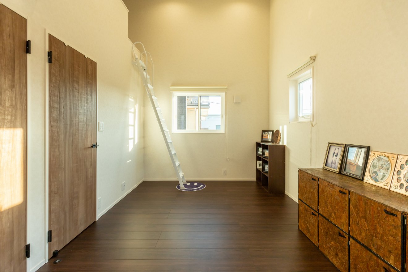 【スキップフロア】スキップフロアのスタディースペースは、お子様の勉強には勿論のこと、テレワークにも活用できます。 【子供部屋】将来間仕切りを設けることで、二部屋になるように計画された子供部屋。一部が勾配天井となっており、ロフトを利用した小屋裏収納とつながっています。