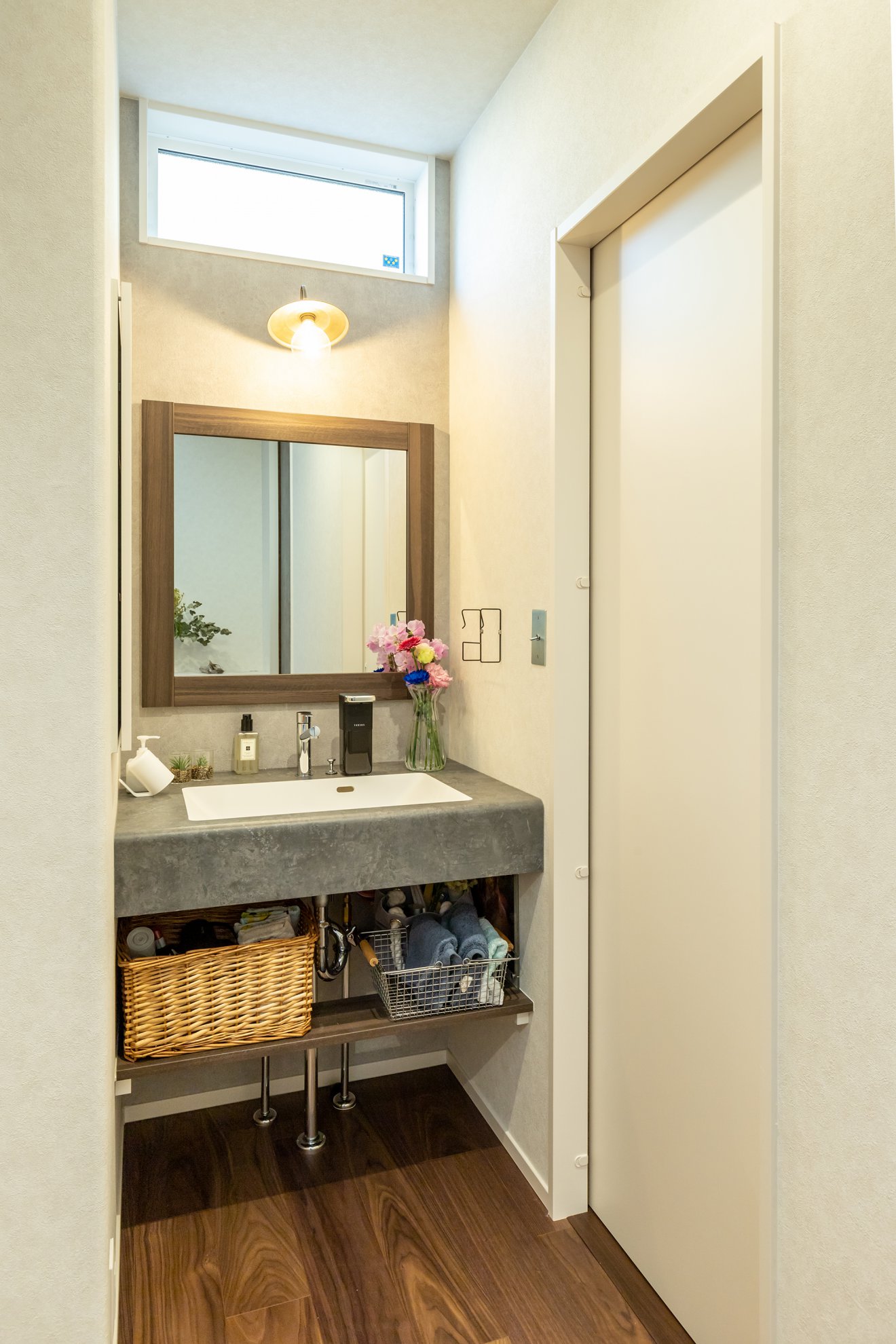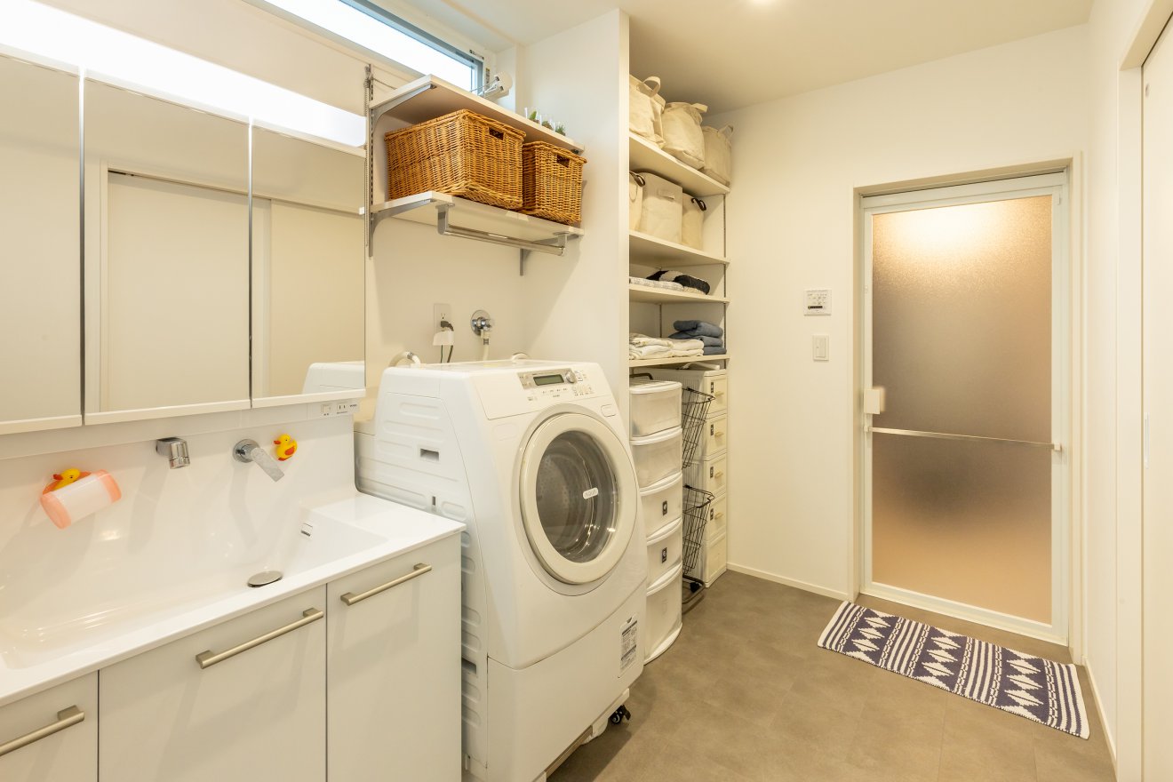 【洗面脱衣室】可動棚を利用した収納力バツグンの洗面脱衣室。整理整頓もしやすいから、家事もラクラクこなせます。 【洗面台】玄関ホールにあるお洒落な造作洗面台。来客の目には触れない場所ですが、細部にも気を配りました。