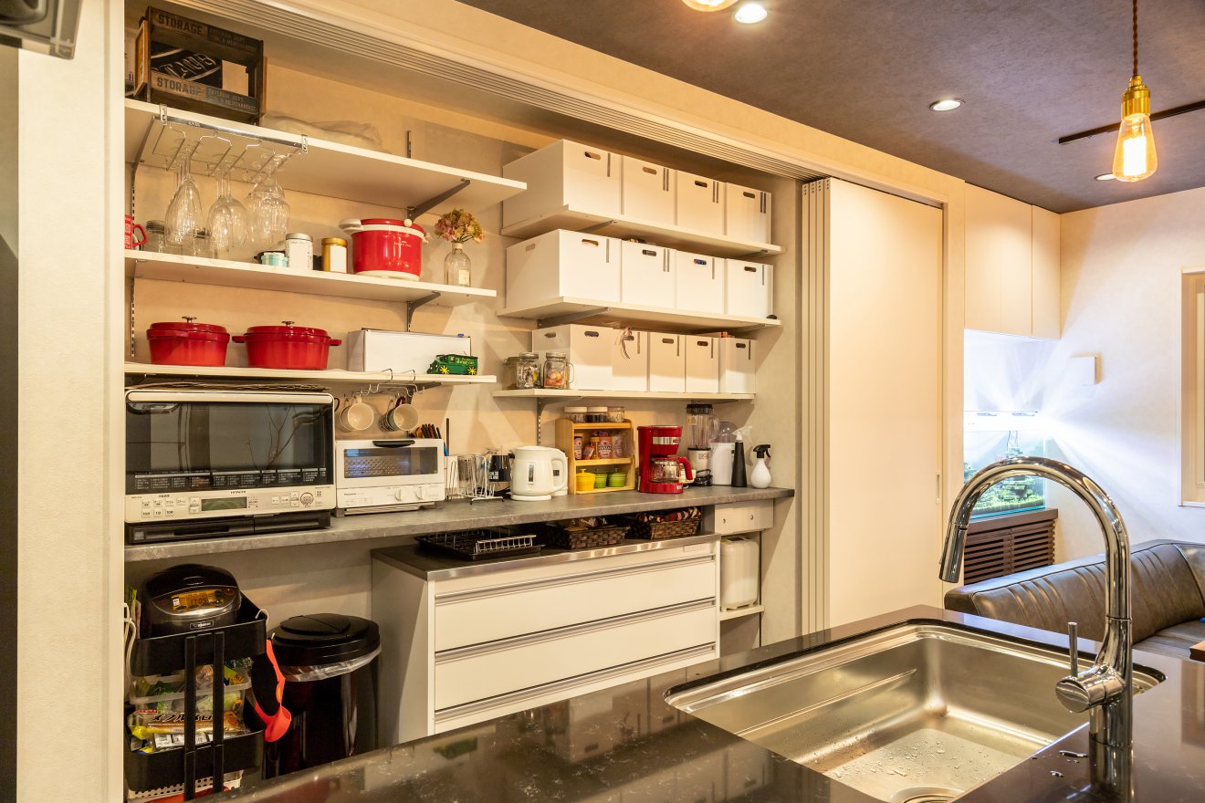 【キッチン収納】キッチン背面の収納は全て扉で隠すことができます。生活感を出さない工夫の一つです。