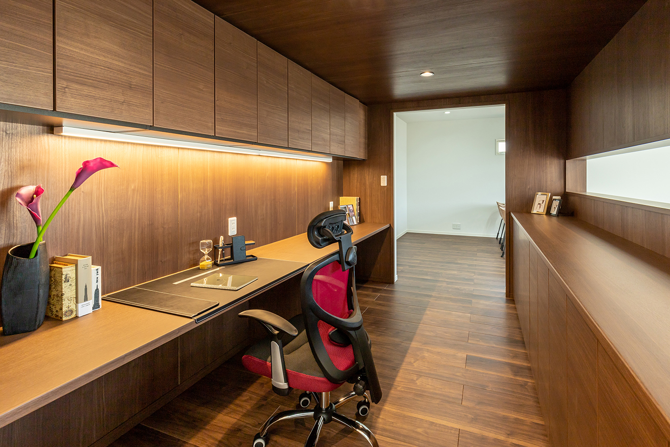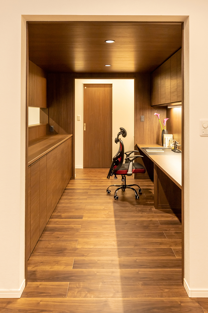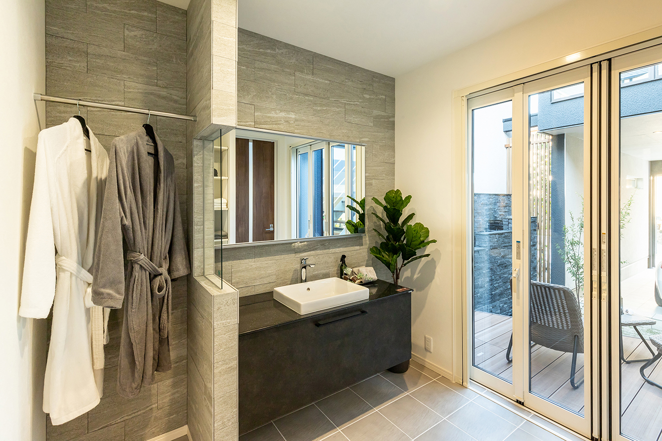 【ホール】天井が低く、洞窟のようなイメージの書斎。 【洗面】高級感溢れるタイル貼りの洗面。直接繋がっているので、入浴後にウッドデッキでリラックスすることができます。