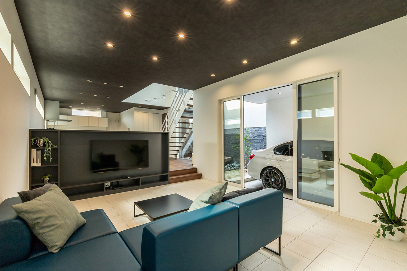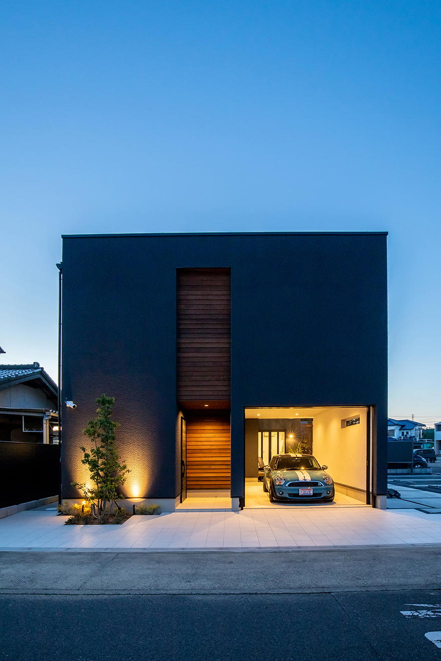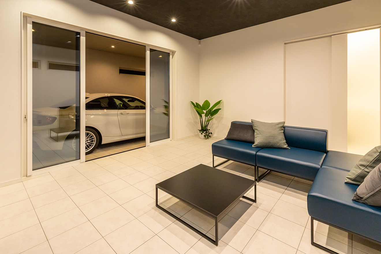 【夜景・外観】ライトアップされることで、正面の木目調やビルトインガレージの魅力がより高まります。 【夜景・リビング】ガレージとはガラスサッシで仕切られているため、室内から、まるでギャラリーに居るかのように、愛車を眺めることができます。