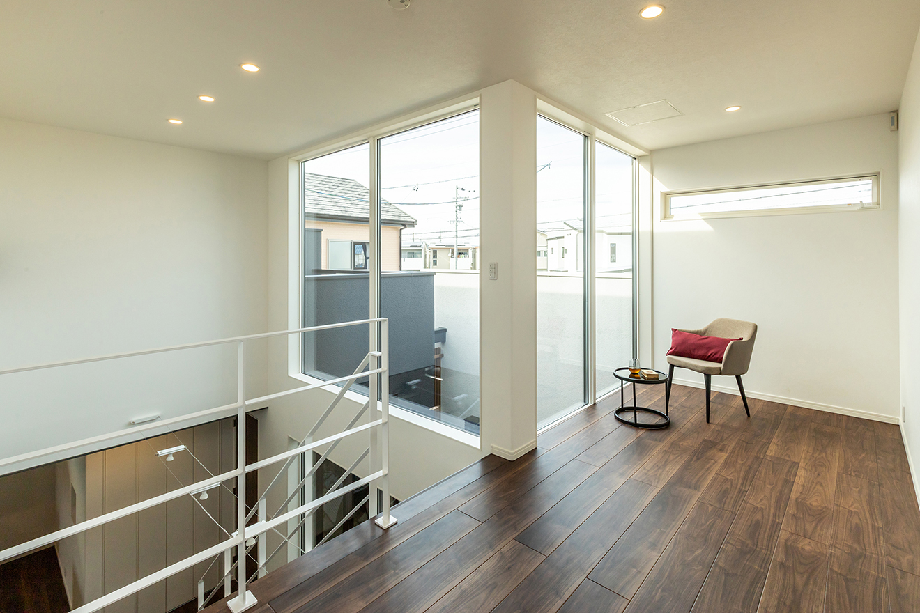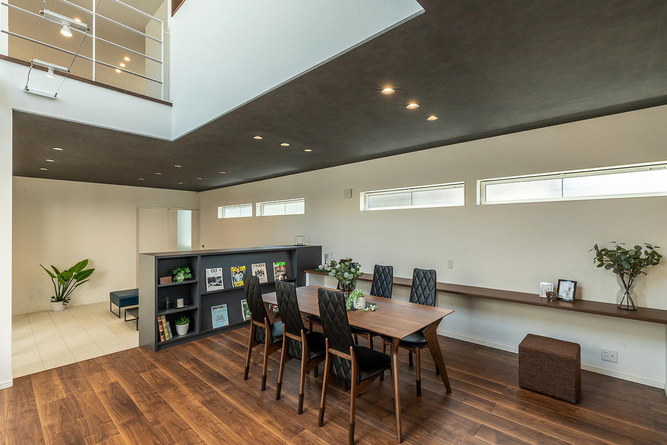 【LDK】吹き抜けを通して上下階につながりが生まれるため、どこに居ても家族の気配を感じられるため安心感が生まれます。