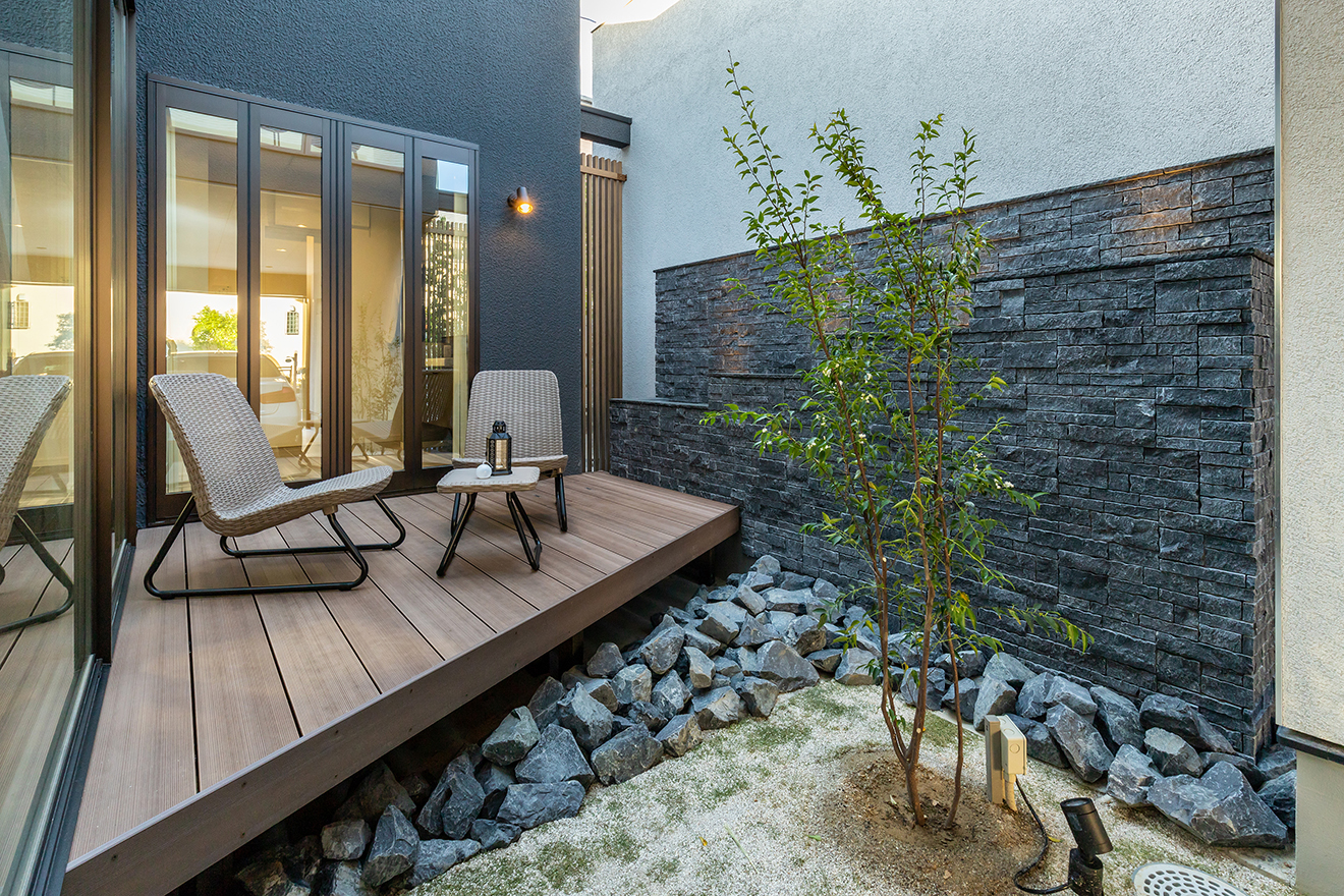 【ウッドデッキ】流れる水の音に心癒されるウォーターガーデンのある中庭。愛車を眺めながらゆっくりと寛ぐことができます。
