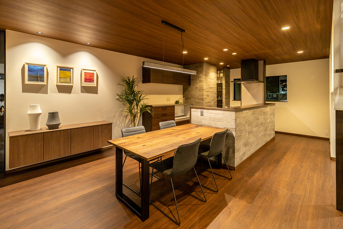 【夜景・DK】キッチンはLDKの景色に溶け込むように、天然石をモチーフにした壁材で彩りました。