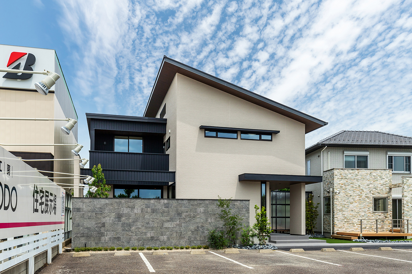 【外観】方流れ屋根に、外壁をサイディング+ガルバリウムでまとめた外観。 【玄関ホール】高級感あるタイル貼りの壁面に、フロートタイプの収納を合わせたラグジュアリーな空間。