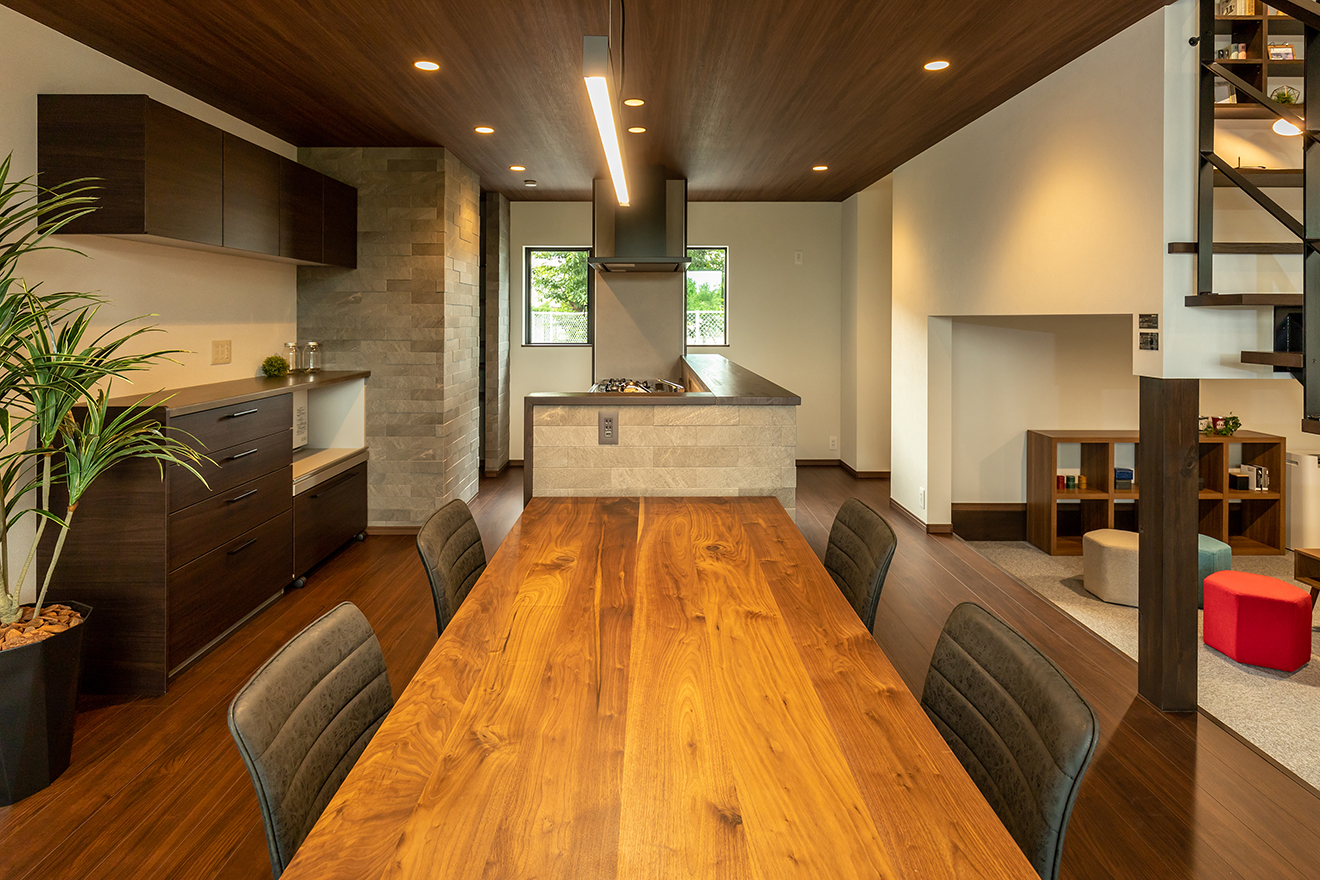 【リビング】リビングとダイニングに囲まれたタイルデッキの中庭は、室内ともフラットにつながり、空間に広がりをもたらします。 【DK】カウンターと腰壁で三方を囲んだキッチン。手元が隠れるので、お客様にもスッキリとした印象を与えます。