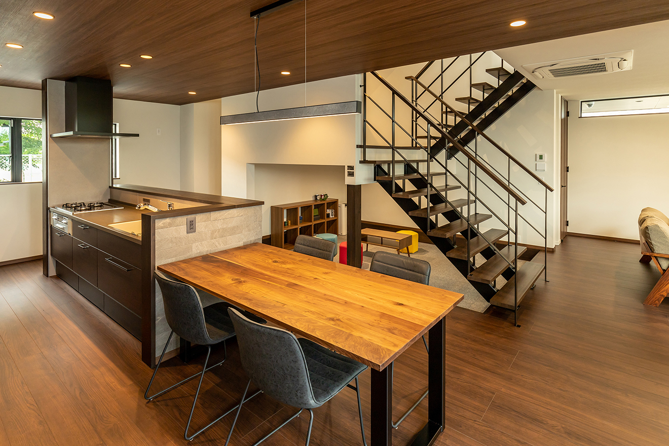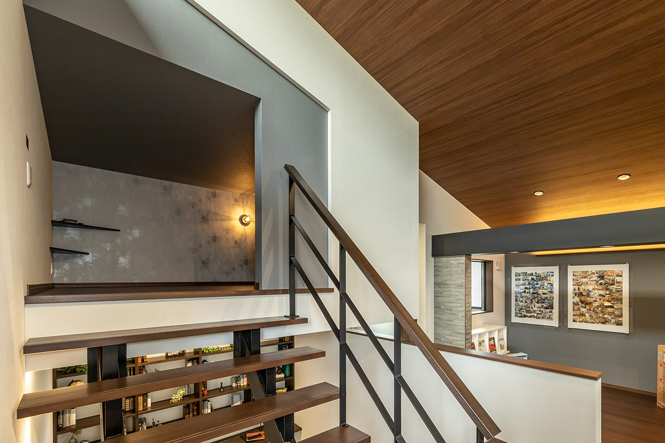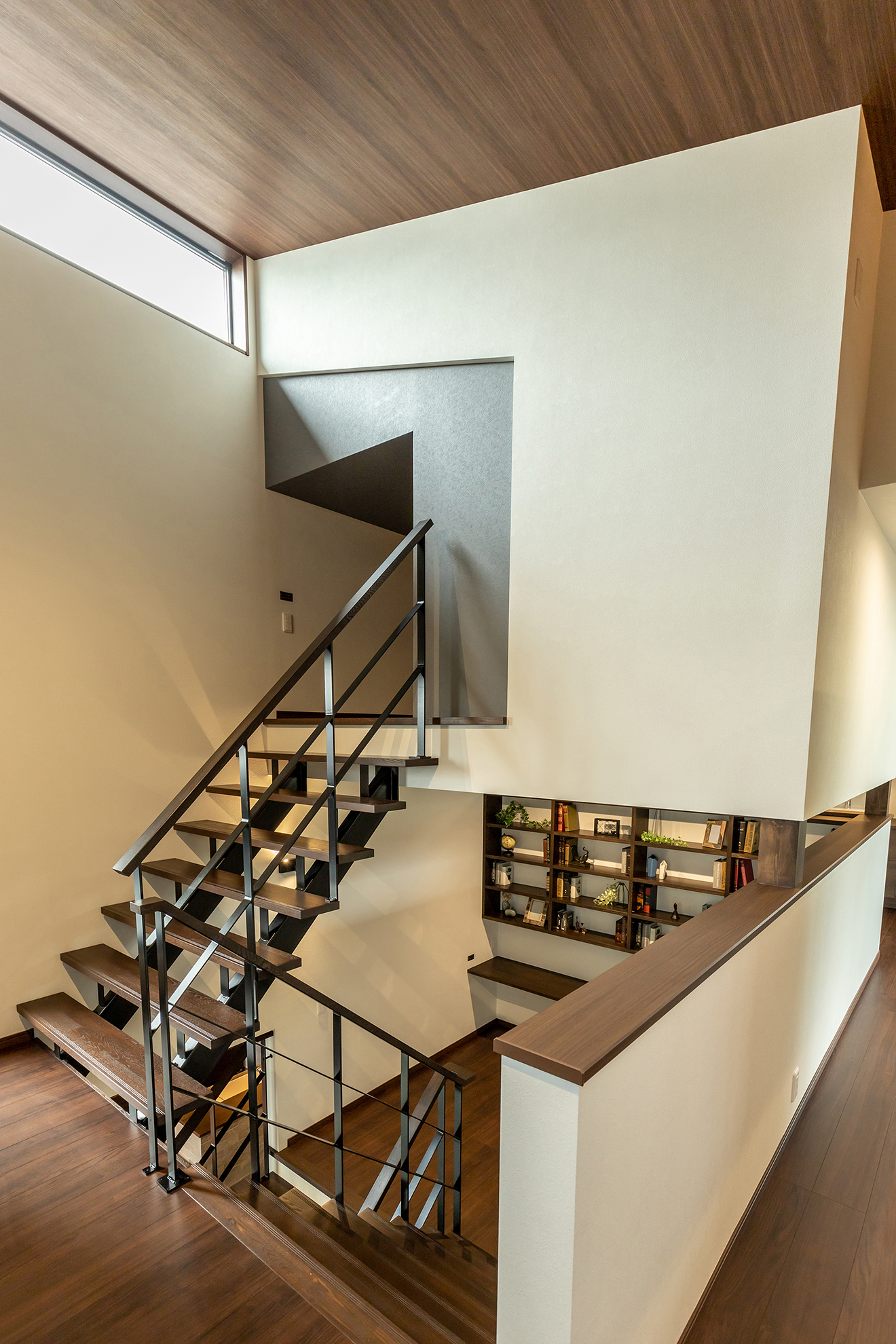 中央の吹き抜け部を三層にした、立体的な空間構成が特徴の住まい。スキップフロアを挟んで、下部はダウンフロアのプレイルーム、上部の小屋裏はヌックスペースとしました。書斎として利用できるスキップフロアは、周囲を壁で塞いでいないため、いつでも家族の気配が感じられます。また、そこから生まれる視覚的な抜けが、LDKに斜め上方向への広がりをもたらし、室内が実際よりも広く感じられるように。トップのハイサイド窓からは穏やかな光が階下に落ち、ライトウェル(光井戸)の様に働くのも一つです。