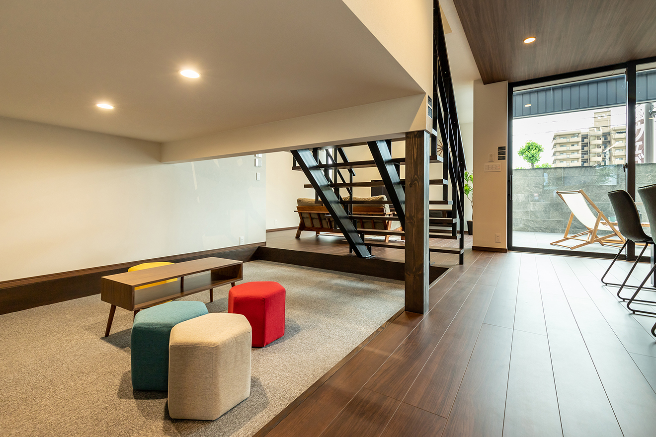 【プレイルーム】スキップフロア下部はダウンフロアにしてお子様のプレイルームに。低めの天井高が秘密基地のようで、ワクワク感を誘います。また、LDKのどこからでも目が届くので、子供たちだけで遊ばせていても安心です。