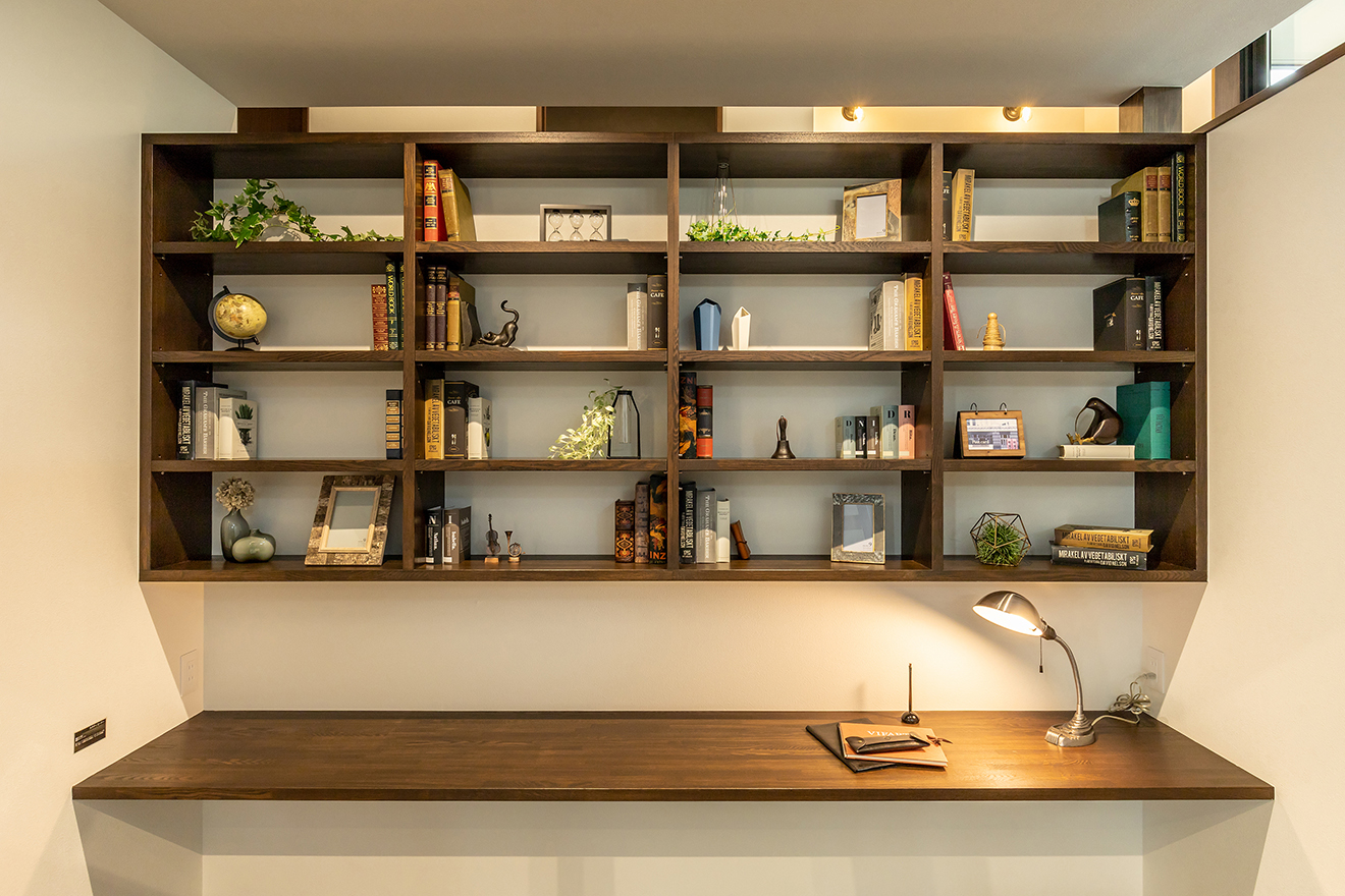 【スタディコーナー】一番の見どころのスキップフロアです。大型のカウンターと造り付けの本棚も備え付けており、書斎としても機能します。