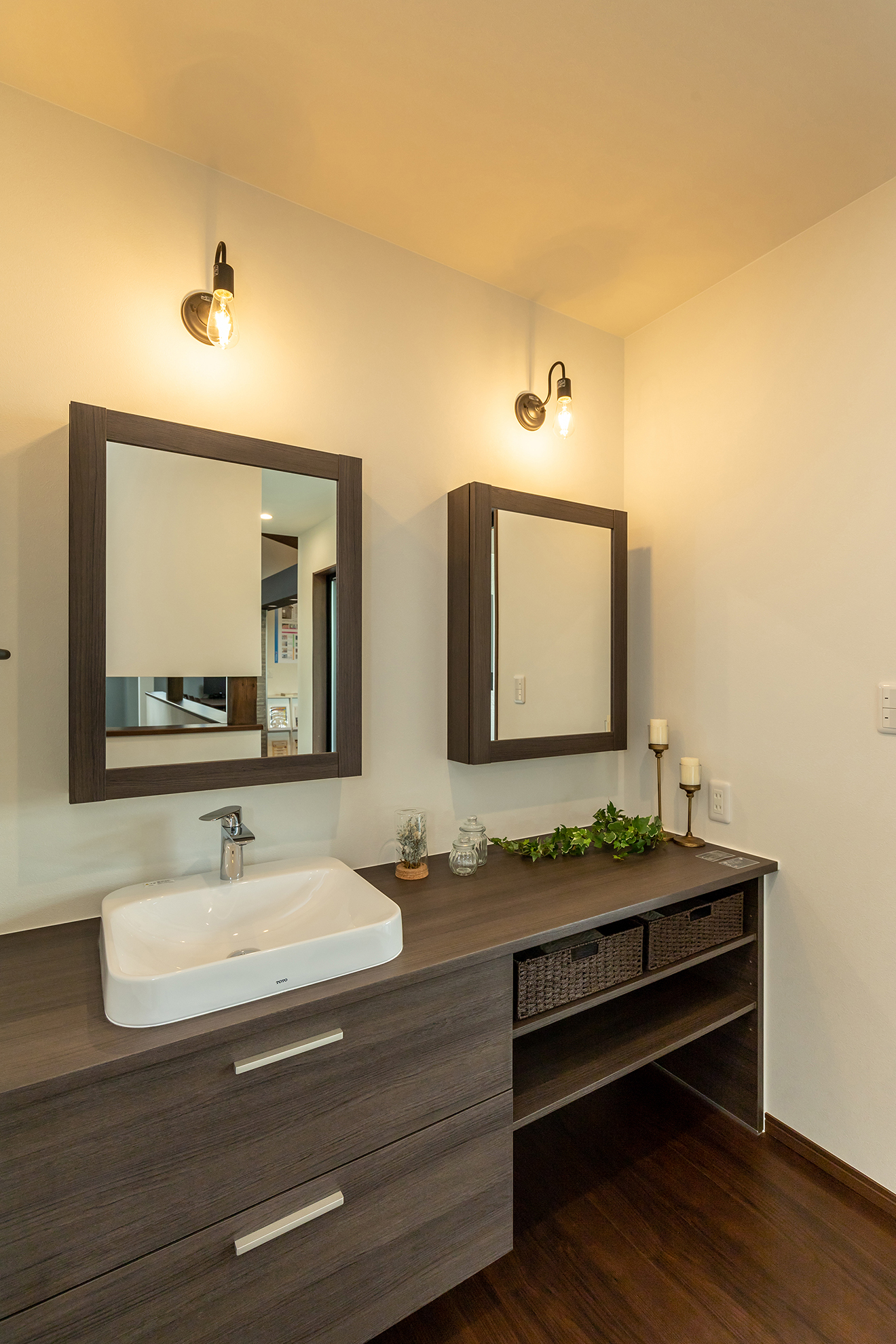 【フリールーム】床色と合わせた天井の化粧板が洗練された空間を作り出します。 【2階・洗面】1階とは別に洗面を設けることで、忙しい朝の時間帯でも渋滞が起きづらくなります。