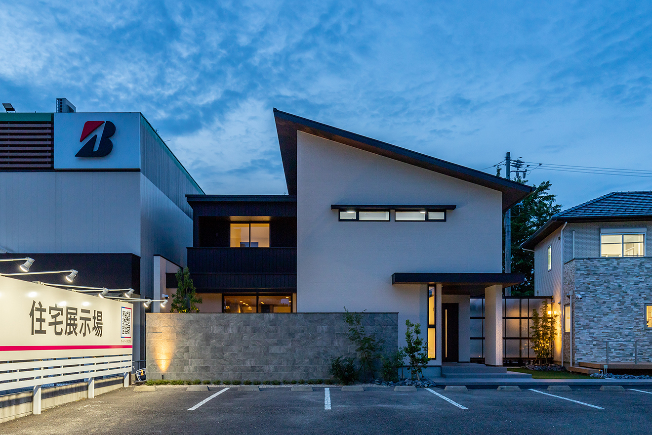 【夜景・外観】ライトアップされた石目調のアクセントウォールも特徴です。 【夜景・LDK】階段は光を下に取り込めるようにストリップ型をセレクトしました。