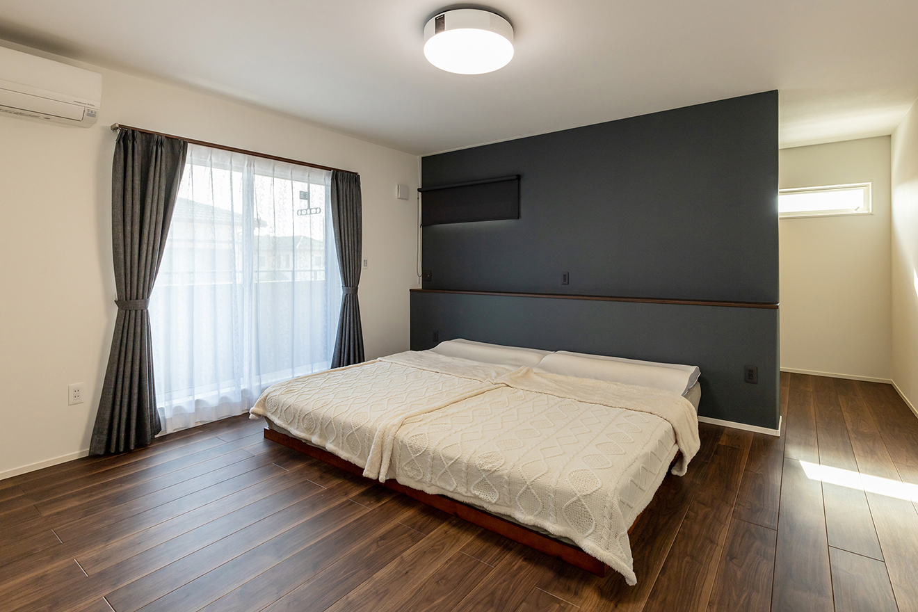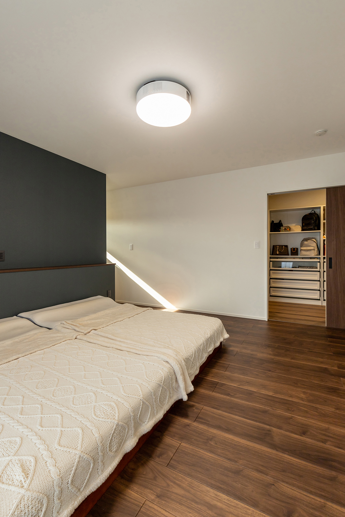 【寝室】ベットの背面にはシックなグレーでまとめたカウンター付きの仕切りを設置。背面には書斎、収納スペースも設けた、空間に余裕のある寝室です。