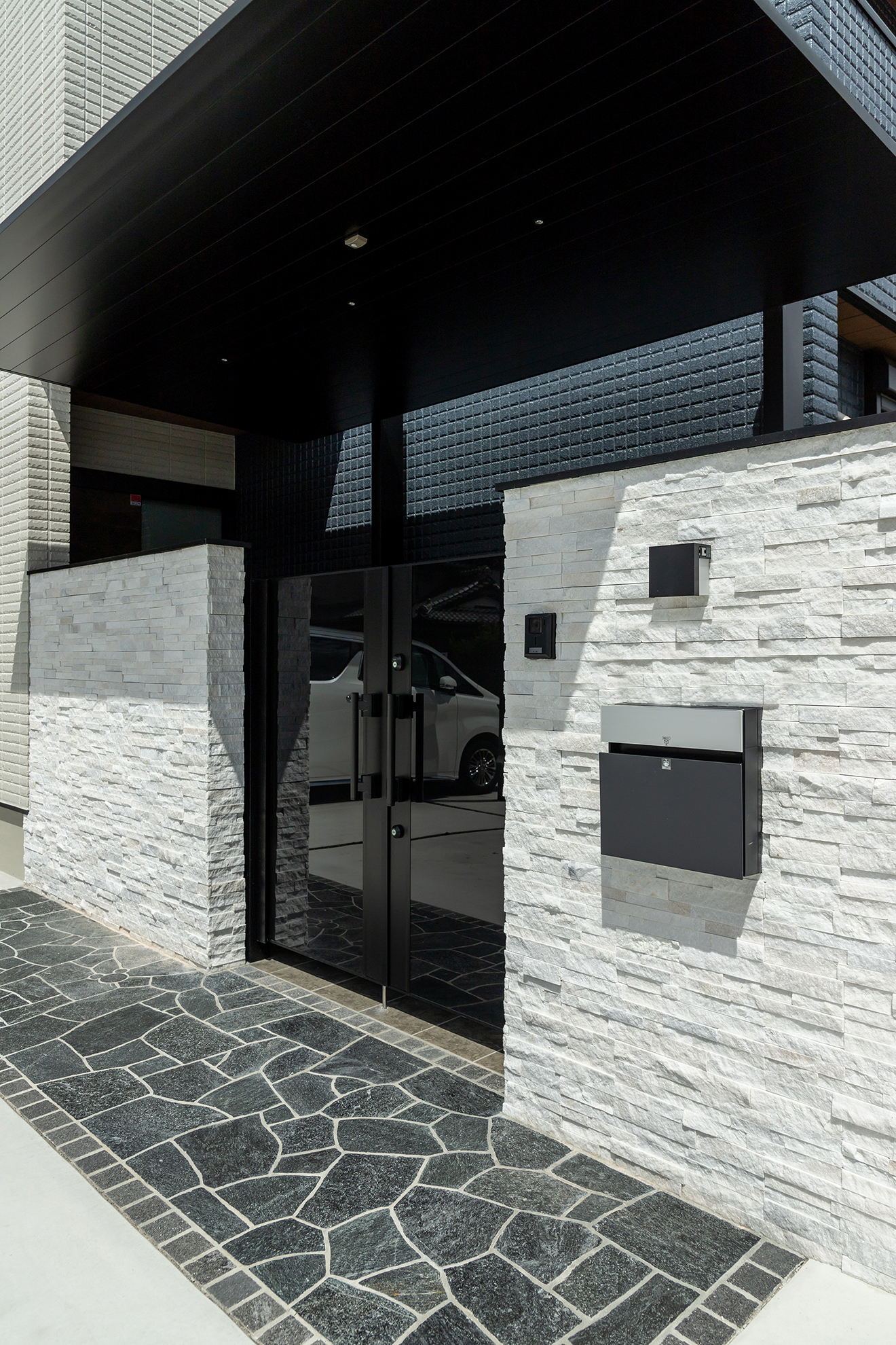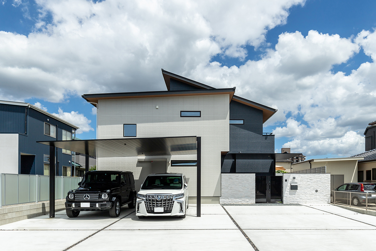 【外観】角度の違いによる片流れの屋根、軒天の木目調や白黒のコントラストが印象的な外観。太陽光も搭載しており、パワーボードの風合いが良い印象を与えます。玄関までのアプローチには、雨や日差しを遮るのに便利な屋根を設置しました。